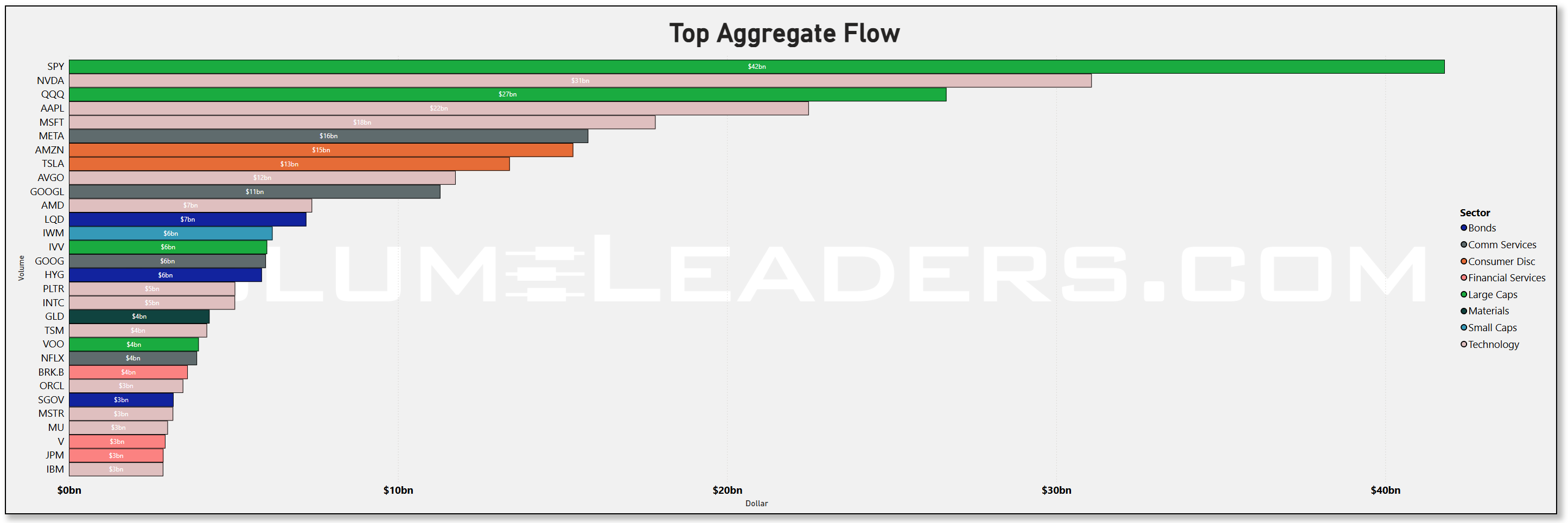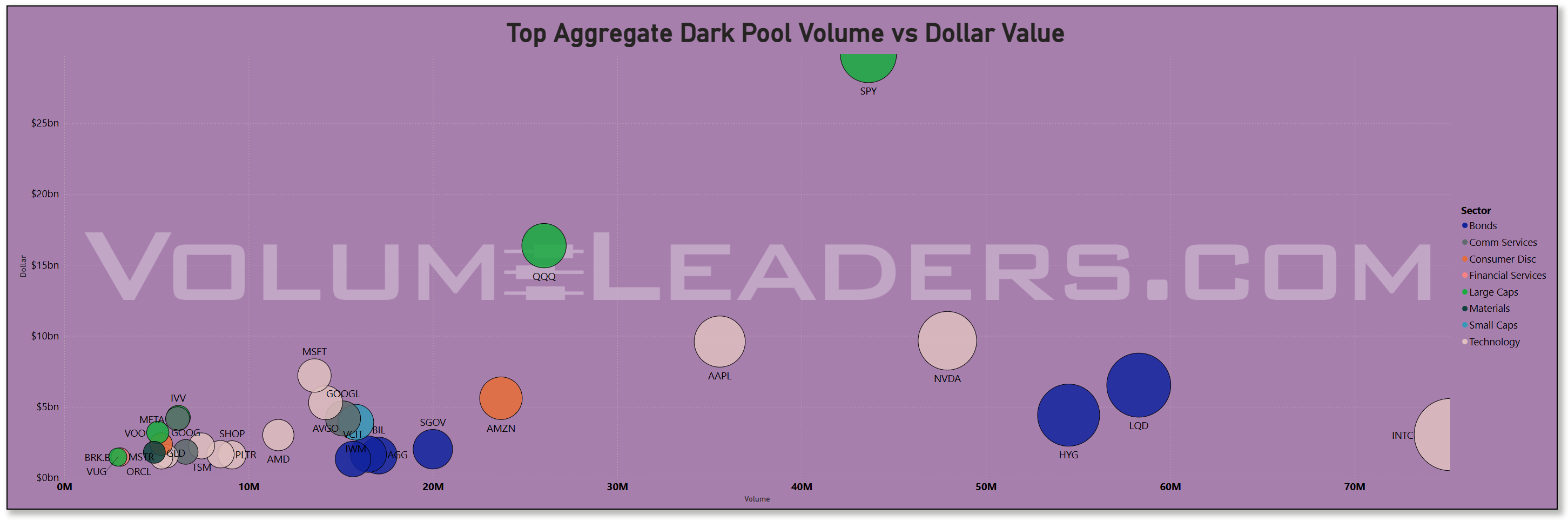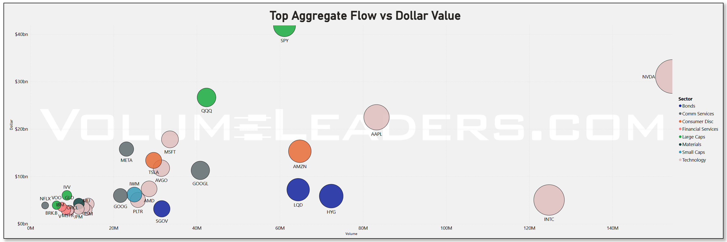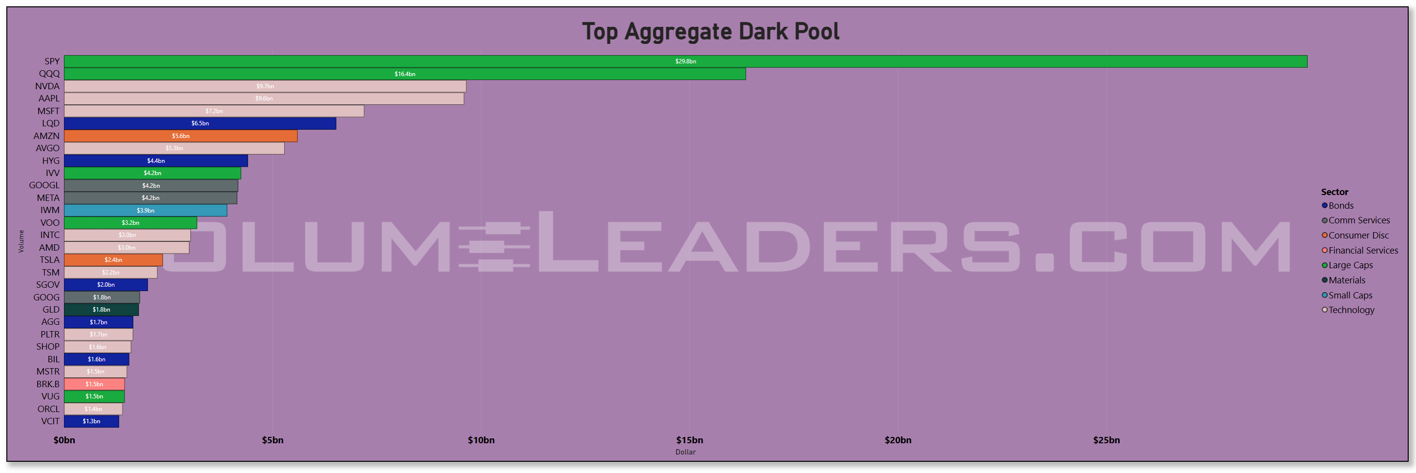 What to watch next: first, continued size in SPY, QQQ and perhaps IVV/VOO would confirm the index-anchor posture remains intact. Second, another round of dark-pool flow in NVDA, AAPL or MSFT would validate the internal accumulation thesis in tech. Third, momentum in credit sweeps such as LQD or HYG holding bid would signal that carry trades are still active and the pivot in rates is being positioned. If flows shift into Industrials (say >$12 billion day) or Financials (> $13 billion) it could mark a regime break toward cyclicals; if not, the narrow leadership tilt remains active.