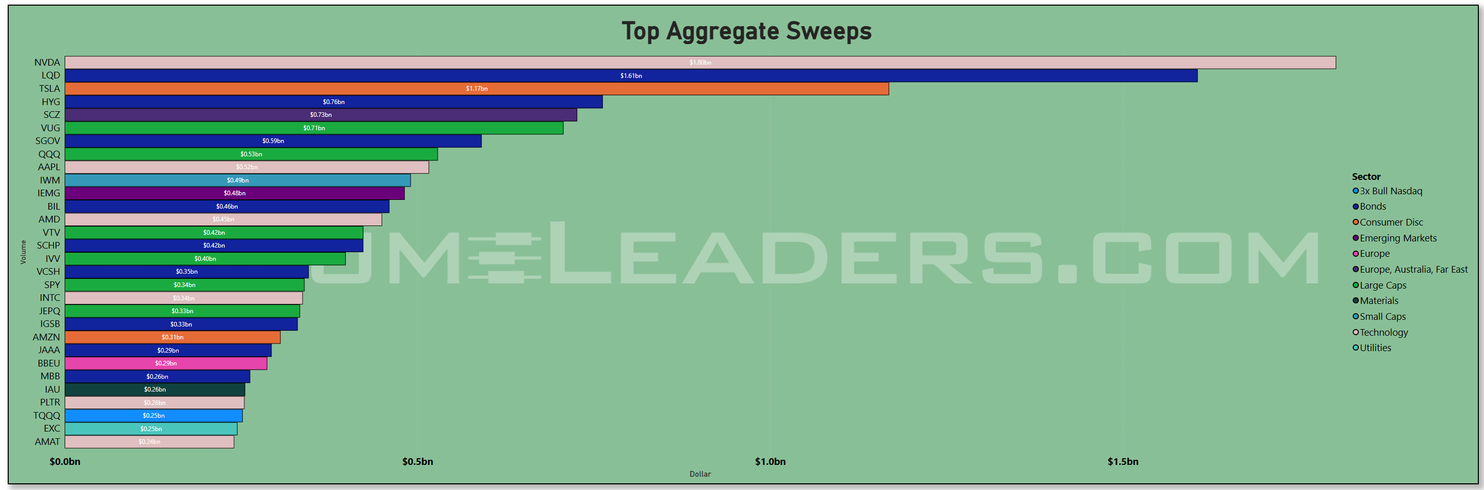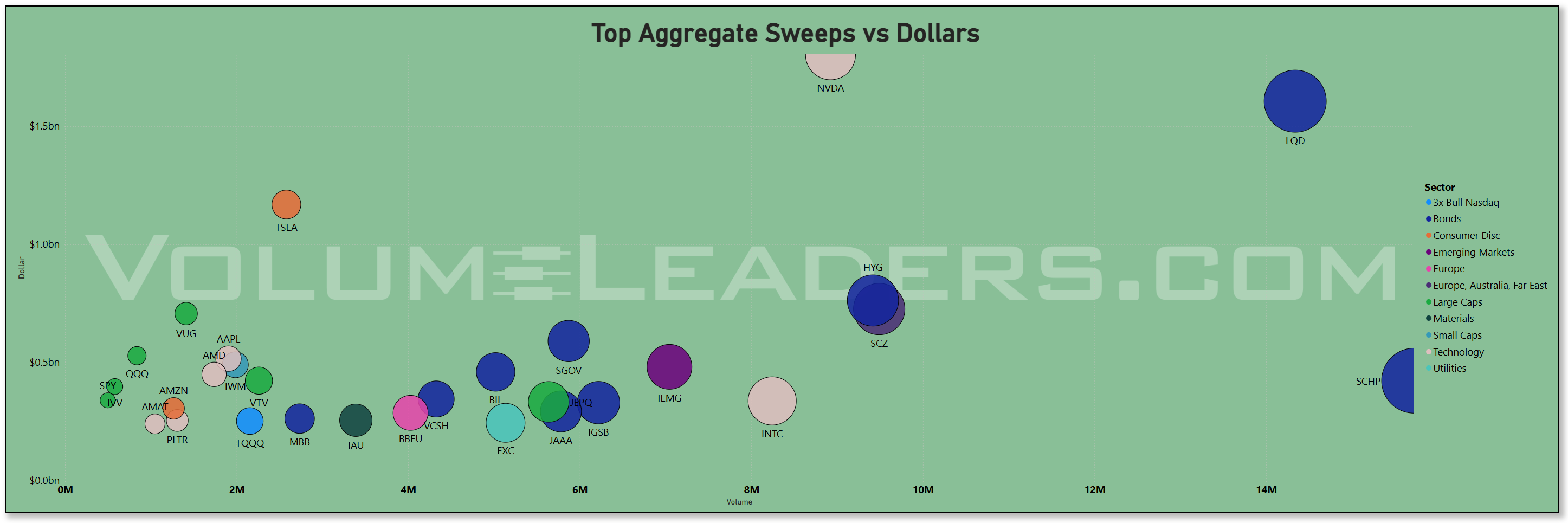 On the sweep front (high-frequency aggressive executions), the top names include NVDA with approximately $1.80 billion in sweep dollars, and LQD among the largest in fixed income sweeps at ~$1.61 billion. The sweep scatter shows NVDA carrying both significant volume and dollar value, while TSLA, VUG and PLTR appear further down but notable. The presence of LQD sweeps suggests that credit traders are actively repositioning, possibly bracing for a pivot in rates. Meanwhile, equity sweeps anchoring on NVDA reinforce the high-growth anchor in the book.