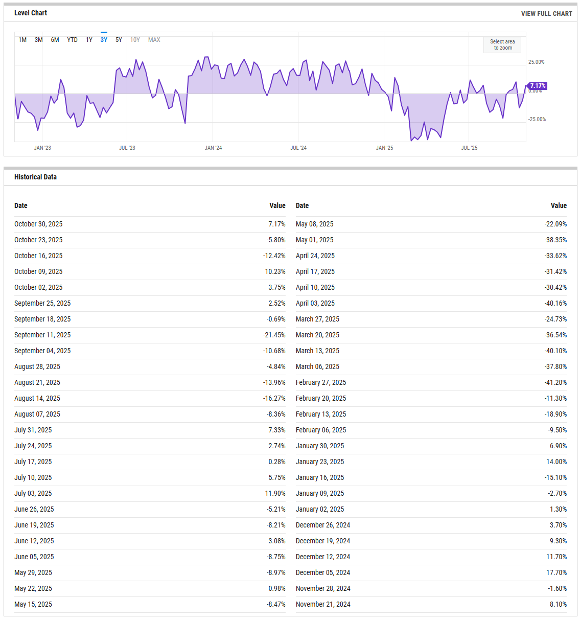 The bull-bear spread has climbed back to +7.17% as of October 30, rebounding from -5.80% last week and a deeply negative -12.42% two weeks ago. This swing from net bearish to modestly positive sentiment signals a fast transition from fear to cautious optimism. Historically, readings below zero tend to coincide with exhaustion phases that precede rebounds, while a sustained move above +20% marks crowding risk. The present level is mid-range — not euphoric, but not washed out either — implying traders have quickly rebuilt confidence without fully re-leveraging. A move above +10% would confirm that optimism is hardening; a drop back below zero would warn that enthusiasm has faded just as quickly as it returned.