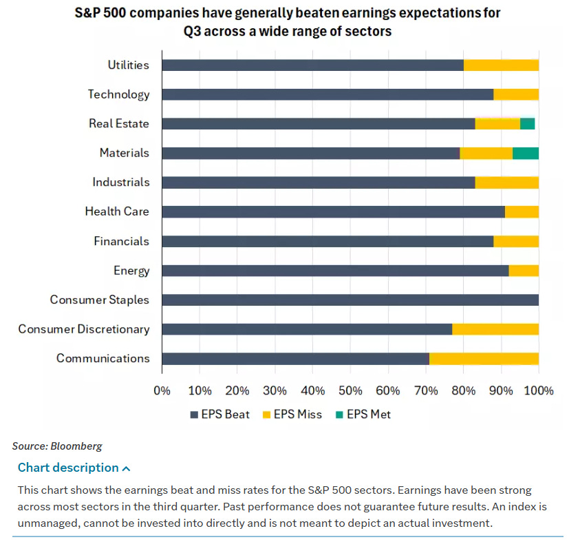 Corporate earnings season is driving that resilience. By Friday, more than 60% of the companies in the S&P 500 had reported Q3 results, and more than 80% of them had beaten earnings estimates, which is an important pillar of support for U.S. equities. According to Bloomberg Intelligence, 80% of S&P 500 companies that have reported so far this quarter have beaten forecasts, putting this quarter on pace to be the strongest since 2021. FactSet data puts the number at 83% beating consensus estimates among the roughly 64% of the index that had reported as of Friday morning. The message so far is that companies have managed to defend profitability even through elevated costs, higher funding rates, and a slowing consumer. It is also true that the absolute rate of profit and sales growth is decelerating, and the market is not blind to that. Q3 profits are expected to have risen by 7.2% year over year, which would be the smallest earnings increase in two years. Q3 sales growth is projected to slow to 5.9% year over year from 6.4% in Q2. Investors have chosen to lean more heavily on forward narrative and the durability of AI-related capital expenditure than on those deceleration markers, but the deceleration is there. The single stock tape has rewarded companies that can point to visibility through 2026 and punished companies that admit to consumer fatigue or cyclical weakness.