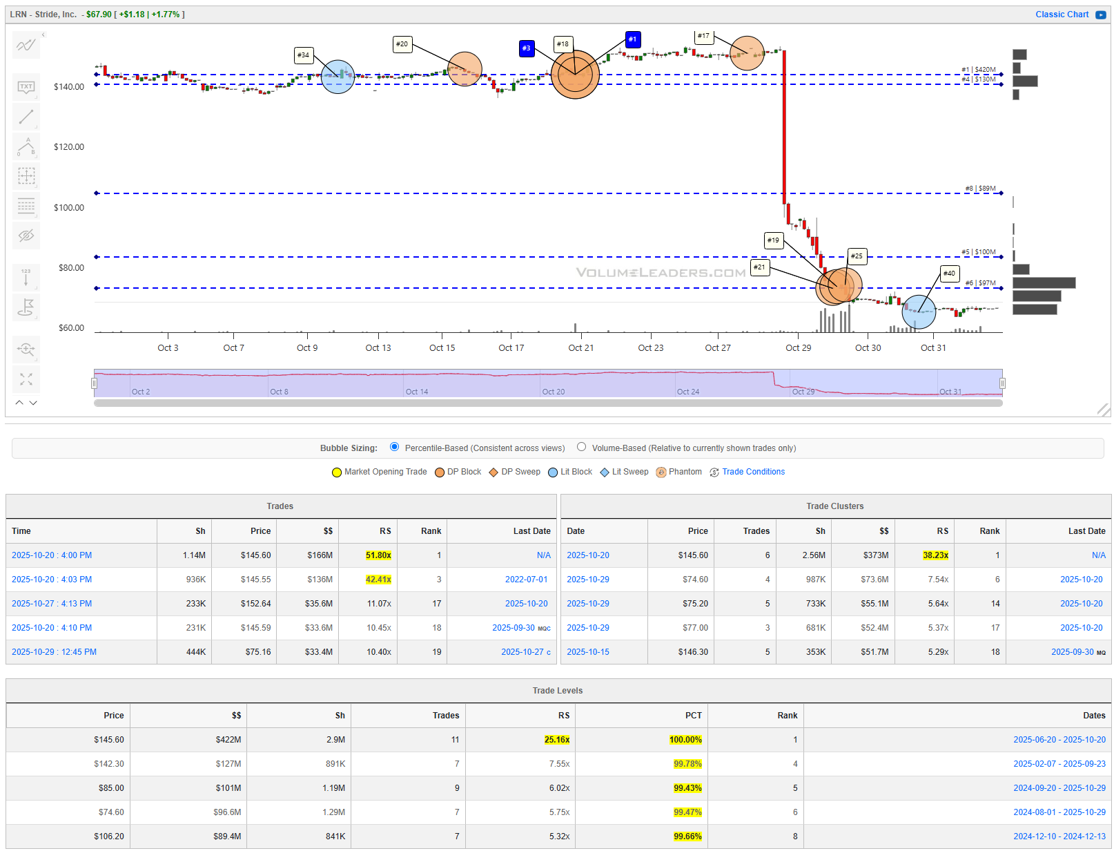 On October 20 I spotted a dark pool on LRN ranked number one. Whenever I see a top-ranked equity like that, the first thing I check is the next earnings date. It turned out to be October 28, eight days away. That instantly made me think someone might know something ahead of earnings.