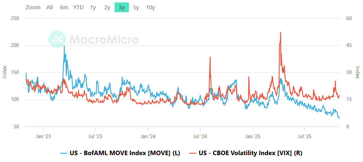 Both volatility gauges remain subdued. The MOVE index, tracking Treasury volatility, has collapsed toward the low 90s, its quietest level since early 2023. The VIX sits near the mid-teens and continues to compress alongside it. Historically, when both vol complexes decline together, risk markets trade with a stable bias, but complacency rises. The tripwire is a MOVE spike back above 120 while VIX remains docile, which often foreshadows equity stress as rates volatility leaks into equities. Conversely, if VIX jumps while MOVE stays calm, it would signal rotation toward hedging equities specifically. For now, cross-asset vol alignment favors stability, but it is approaching the kind of calm that rarely lasts.