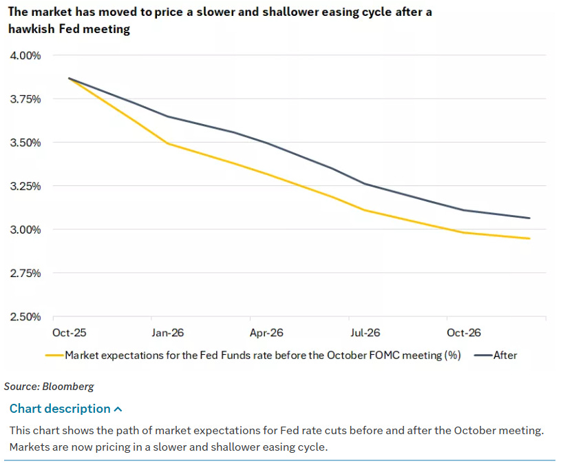 The Federal Reserve added its own drama this week. On Wednesday, the Fed lowered its target range for the federal funds rate by 25 basis points to 3.75% to 4.00%, as widely expected. That puts the fed funds rate some 150 basis points, or 1.5%, below its peak. The Fed also announced that it would stop reducing its holdings of U.S. government bonds in December and effectively end the balance sheet runoff. The Fed had previously built up those bond holdings through large-scale purchases of Treasuries and other assets to help hold down longer-term rates, and then gradually let the balance sheet shrink. The decision to stop the runoff was widely anticipated and did not generate the same market shock as the policy rate cut. What did generate a reaction was the messaging around what happens next.