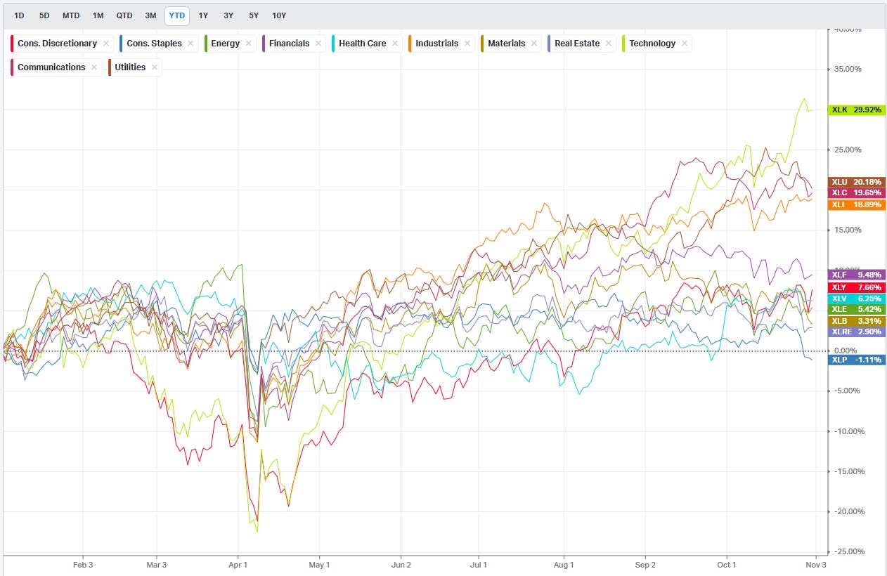 Halloween closed out a month that gave investors plenty of both tricks and treats, and yet the story into month-end is that risk assets continue to climb. Major U.S. equity indexes finished the week with a mixed tone under the surface but positive headlines at the top. The technology-heavy Nasdaq Composite led gains thanks to renewed strength in mega-cap technology that continues to benefit from artificial intelligence spending. The S&P 500 Index also advanced, even though seven of its 11 sectors finished lower and the equal-weighted version of the index underperformed the traditional market-cap weighted index by 268 basis points. That divergence captures the entire mood of the tape right now. A narrow handful of massive technology leaders are doing most of the work while smaller-cap and interest rate sensitive areas struggle to hold on to October’s early momentum. The Russell 2000 closed at 2,479, up 13 points, but small and mid-cap indexes overall fell more than 2% on the week and gave back much of their recent progress as rates drifted higher. The Dow ended the day at 47,563, up 41 points. The S&P 500 settled at 6,840, up 18. The NYSE FANG+ Index ended at 16,920, up 70. Outside equities, ICE Brent Crude finished at 65.07 USD per barrel, up 0.07 USD. Gold ended at 4,018 USD per ounce, up 2 USD. Bitcoin finished near 109.4k, up 1,526.