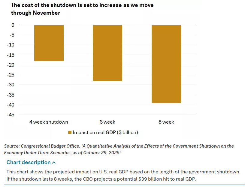 The shutdown is also delaying the first estimate of Q3 GDP, and it threatens to interrupt SNAP benefits for roughly 40 million Americans if it drags on. Bloomberg Economics estimates that the shutdown has already taken around 1% off annualized Q4 GDP growth. That drag could rise to 1.5% by mid-November and 2% by late November. In dollar terms, that would equate to nearly 40 billion USD. The government shutdown is also providing mechanical support for Treasury prices in one respect. The logic is straightforward. If the shutdown leads to additional job losses, reduced consumer spending, and a weaker U.S. economy, that could allow the Fed to continue cutting interest rates. T-notes have received some underlying support from that line of thinking.