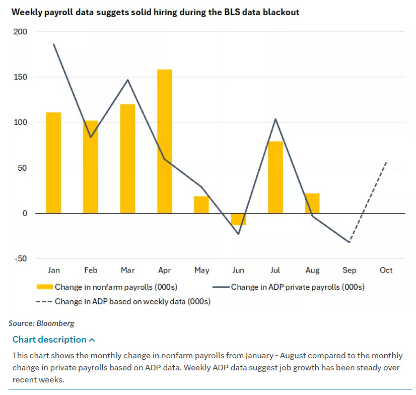 With the federal data pipeline choked off, traders have leaned on private sources to understand where the economy stands. ADP announced that every Tuesday starting this week it will release estimates of its National Employment Report. This week the report showed that 14,250 jobs on average were added for the four weeks ending October 11. That suggests the labor market has improved after job declines in September.