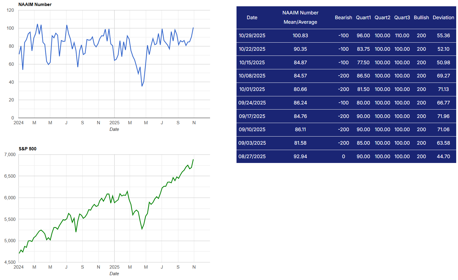 Active managers are once again all-in. The NAAIM Exposure Index surged to 100.83 this week from 90.35 last week, completing a steady climb from the mid-80s in early October. Exposure above 100 implies leveraged long positioning and little dry powder left to deploy. That concentration leaves portfolios vulnerable to any market pullback, as even a routine retracement can trigger de-risking. The last few peaks near this zone have coincided with short-term pauses in price momentum. A slip back into the 80s would suggest some hedging without serious damage, but a drop into the 50s while prices remain stable would flag distribution.