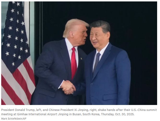 That meeting and the broader trade tour shaped the geopolitical backdrop this week. President Trump and President Xi Jinping agreed to extend a tariff truce, roll back export controls, and reduce other trade barriers. The U.S. will cut fentanyl-related tariffs on Chinese goods to 10% from 20% and extend a pause on some reciprocal tariffs for an additional year, while China resumes purchases of U.S. soybeans, sorghum, and other farm products. China also agreed to pause controls on rare-earth magnets in exchange for the U.S. rolling back an expansion of restrictions on Chinese companies. The meeting was described by President Trump as “amazing, a 12 on a scale of 1 - 10.” The result is essentially a one-year trade truce.