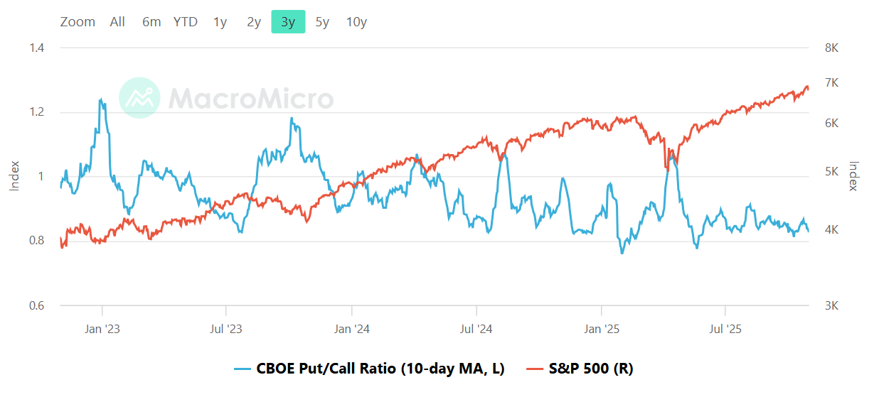 The 10-day moving average of the CBOE total put/call ratio remains near the low end of its three-year range, hovering around 0.75–0.80. That level marks complacency, showing investors are favoring calls over puts at one of the most aggressive skews of the year. Prior rebounds have tended to exhaust when the ratio stays below 0.8 for long stretches, as the absence of downside hedging limits shock absorption capacity. Fearful regimes begin above 1.0, where pessimism is high but contrarian buy setups emerge. For now, sentiment is too one-sided for comfort — a normalization toward 0.9 would actually improve the foundation for any November advance.