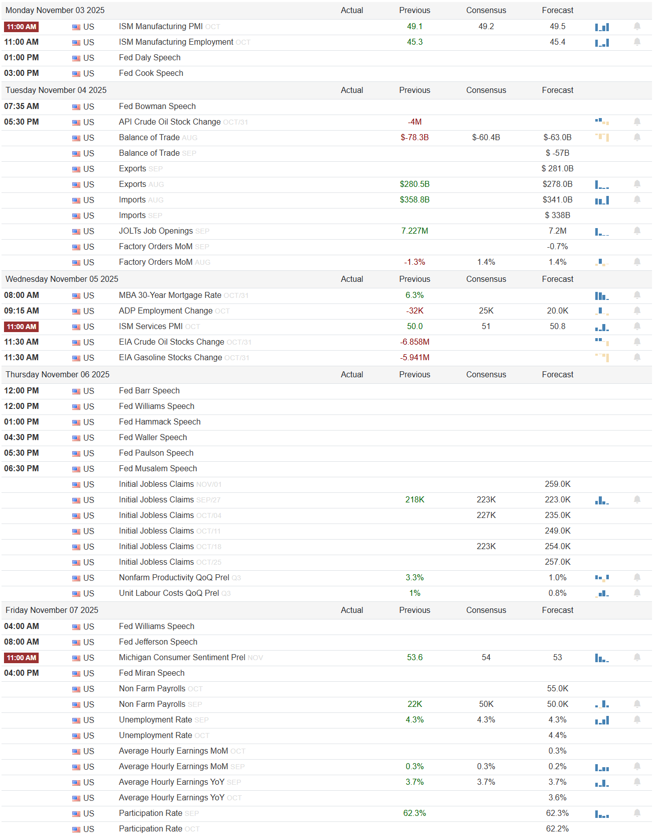 The week ahead opens with manufacturing and labor data that will test the market’s narrative of a soft landing. Monday brings a double-shot of ISM reports at 11:00 AM, with the ISM Manufacturing PMI expected at 49.5 (previous 49.2) and the Manufacturing Employment Index forecast at 45.4 (previous 45.3). Both remain under the 50 expansion line, meaning even a modest upside surprise could fuel a short-term risk-on pulse by hinting at stabilization in industrial activity. Conversely, any miss would confirm contraction and strengthen the case for further Fed easing, pushing yields lower but possibly steepening the curve as traders reposition around growth risk. Fed speakers later in the day—Mester and Cook—could reinforce or challenge that interpretation. If Mester acknowledges weaker employment components, equities might interpret that as dovish confirmation heading into midweek data.