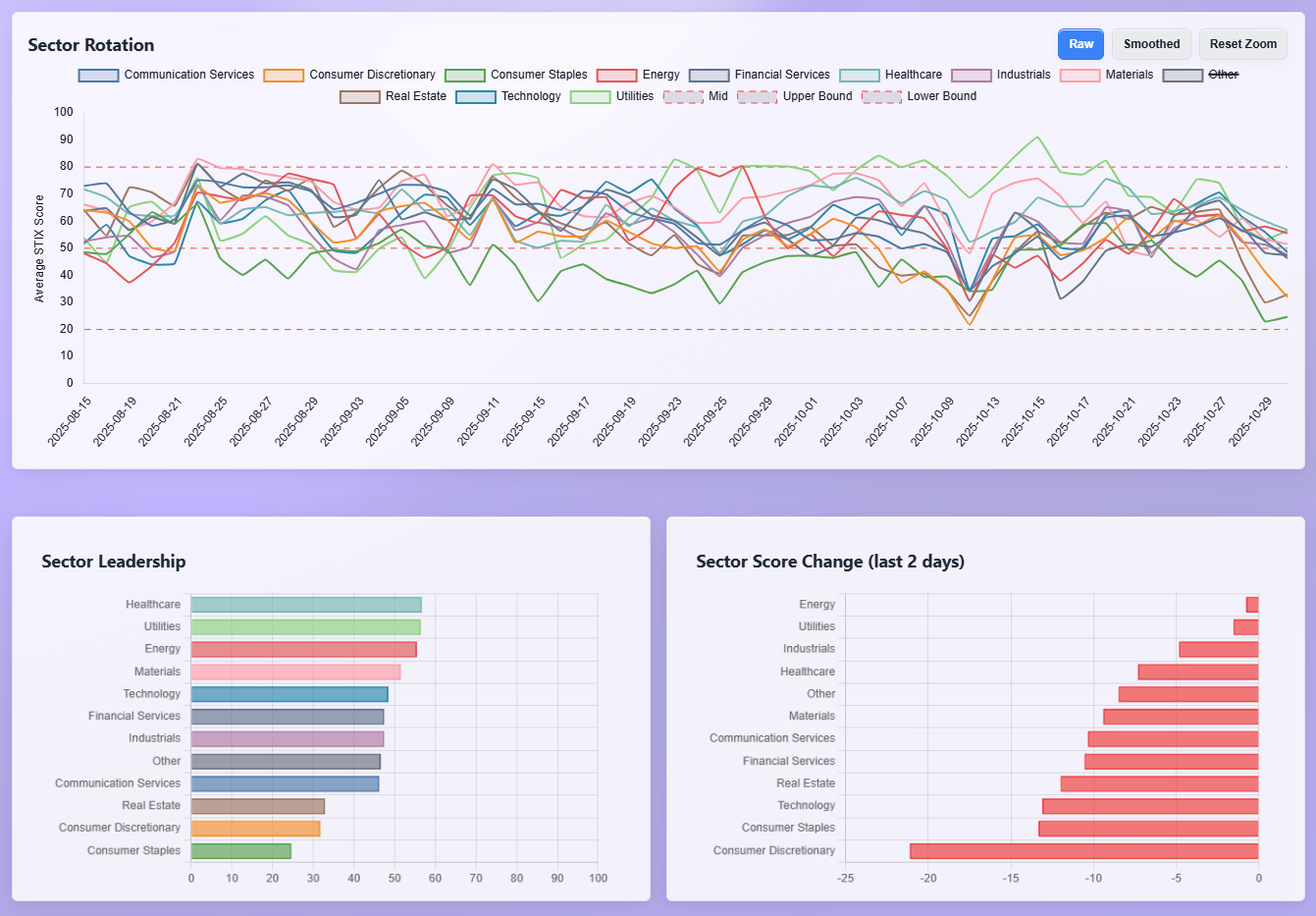 The sector rotation board reveals a subtle but telling shift. Technology and Healthcare still lead on the “Sector Leadership” bar, with Utilities gaining ground in second tier. And in the last 2-day change metric, Financials, Real Estate and Industrials all show despite size, negative momentum, while Energy and Materials are neutral to weak. Technology’s relative strength in the last 48 hours aligns perfectly with the flow analytics (heavy tech concentration). The weakness of cyclicals and financials mirrors the low dollar flows into those sectors and the lack of dark-pool accumulation there.
