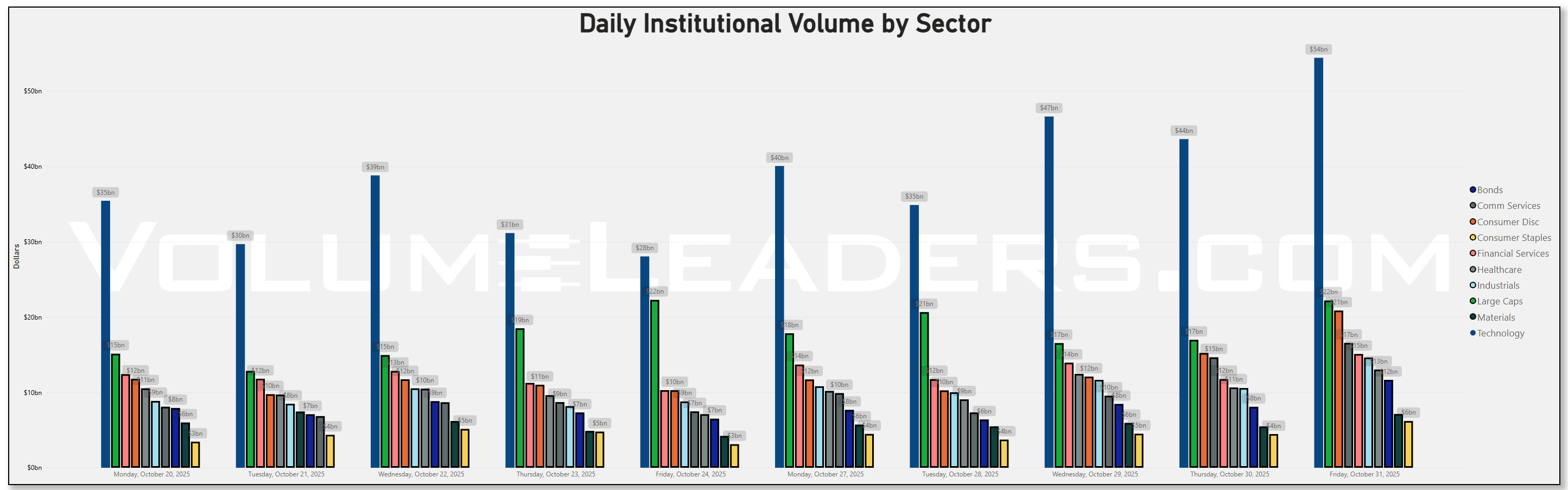 Across sectors, Large Cap equity dominated the flow profile for much of the week, but there was a meaningful narrowing of breadth. On Monday and Tuesday, Technology and Communication Services were prominent, with aggregate daily sector volume in the mid-$40 billion+ range for Tech and the mid-teens for Comm Services. In contrast Financial Services and Industrials trended toward the lower end of the ~$10 billion–$12 billion band by week’s end. Comparing last week’s flows to this week, Tech held its momentum, while cyclicals really lagged: Industrials went from a stronger mid-$14 billion day to approximately ~$10 billion, and Financials slipped from ~$12.4 billion to nearer ~$9 billion by Thursday. This signals institutions piling into defensive/high-quality Growth rather than broad beta or cyclical exposure.
