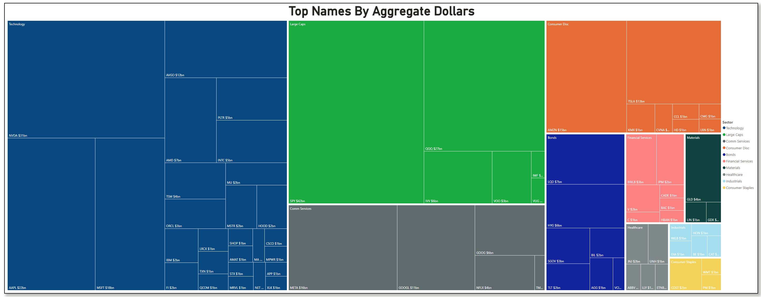 Turning to the concentration of dollars, the treemap and aggregate bars show that portfolios continue to load up on mega-cap names and core indices rather than second-tier breadth. The names at the top include SPY (~$42 billion in aggregate dollars), NVDA (~$31 billion), and QQQ (~$27 billion). AAPL (~$22 billion) ranks just behind MSFT (~$18 billion).