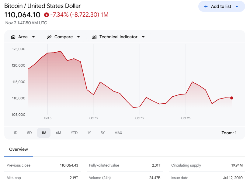 Gold was one of the cleanest examples of how far momentum can run before it reverses. Gold ripped higher for eight straight weeks and printed record highs near 4,400 USD per ounce earlier in October. That advance made precious metals one of the most crowded momentum trades in the market. Then the air pocket hit. Gold pulled back sharply in the second half of the month, dropped below 4,000 USD, and then recovered that level into the end of the week, closing at 4,018 USD per ounce, up 2 USD on the day. Gold is still up roughly 4% this month, even after being down 3% this week, and remains above its 50 day moving average near 3,850 USD and well north of its 100 and 200 day moving averages. Silver, platinum, and palladium all traded in a similar pattern, and platinum finished up 14% on the month. Crypto behaved like a high-beta expression of the same macro impulses. Bitcoin rallied early in the week alongside the broader “risk on” bid but gave back gains in the back half of the week. Bitcoin traded up to test the cluster of overhead moving averages and the levels that marked pre-flash-crash resistance ahead of the October 10 rare earth shock. It could not hold those gains and finished the week back below 100k. Bitcoin ultimately settled near 109.4k, up 1,526 on the session, but the tone into the weekend was corrective.