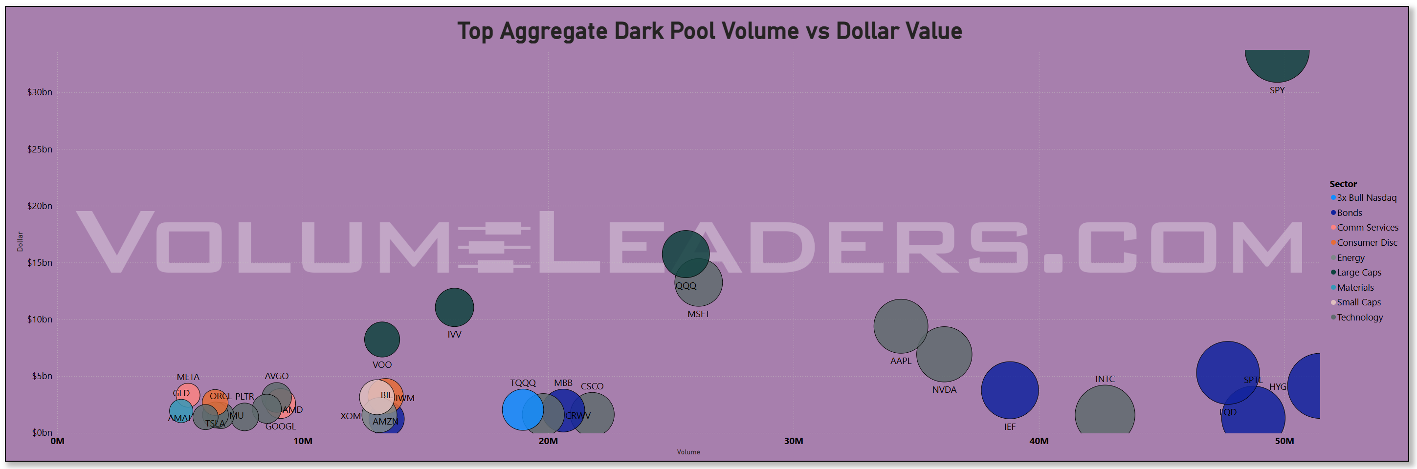 Off-exchange, the dark-pool view shows where the patient hands have been working. SPY again dominates with roughly $33B in dark-pool notional, followed by QQQ, MSFT, and IVV, each in the low-teens billions. AAPL and VOO sit just below that cluster with mid-single-digit billions.
