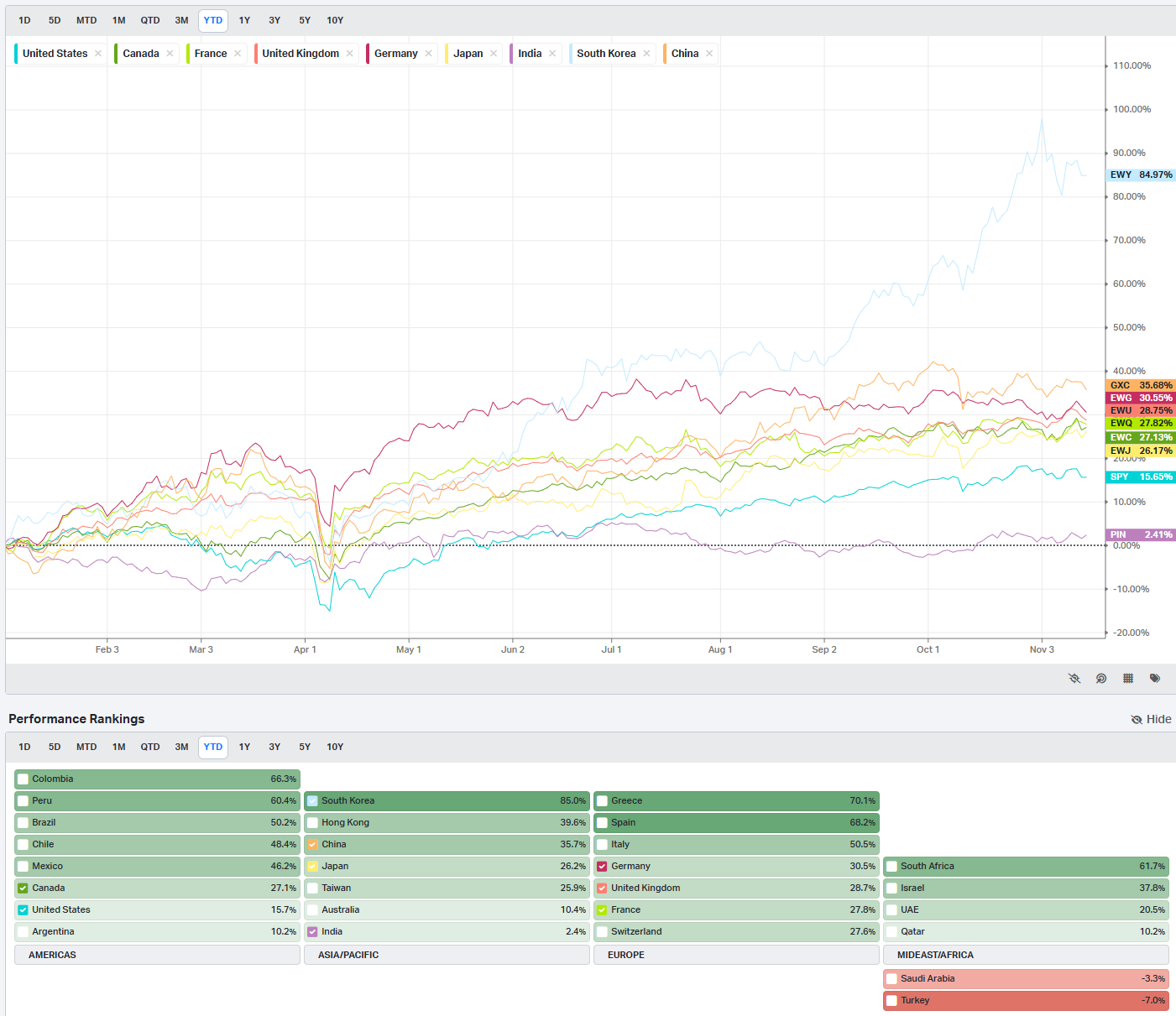 One of the more striking developments outside the U.S. is the relative strength of emerging markets. South Korea was higher for the week despite a sharp decline on Friday, when SK Hynix fell 9%. The iShares MSCI Emerging Markets ex-China ETF, which began to pull away from the S&P 500 in September, is now outperforming by roughly 14% year to date. That outperformance underscores the idea that global capital is not fleeing equities altogether; it is rotating toward regions and sectors that offer better valuations and fresher narratives.
