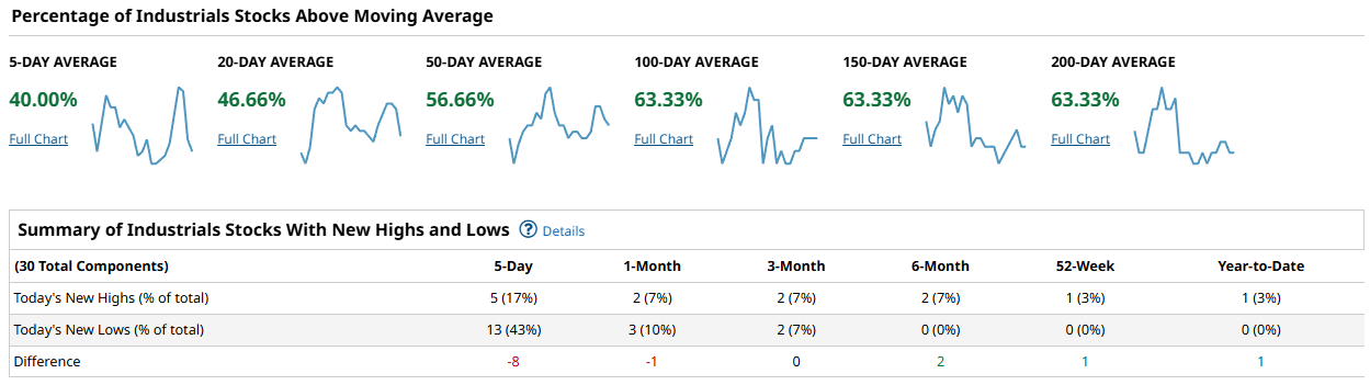 The Dow Industrials, labeled Industrials in the table, are holding up relatively better on a trend basis but not immune to near-term selling. Forty percent of the components are above the 5-day average and 46.66% above the 20-day, which is slightly stronger than the S&P and Nasdaq. Participation then steps up meaningfully, with 56.66% above the 50-day and 63.33% above the 100-, 150-, and 200-day averages. That alignment — a solid majority above every longer moving average — marks the Dow as the structurally strongest of the group. Even here, though, the new high/low profile has turned soft. Over the past 5 days, 5 stocks (17%) have made new highs, but 13 (43%) have printed new lows, for a net -8. The 1-month column is only slightly negative at -1, and by 3-month the difference is flat. The 6-month, 52-week, and year-to-date columns all show small positive nets of 2, 1, and 1. The Dow’s message is that the older, more cyclical leadership still sits in solid uptrends, but even there buyers are taking a breather and allowing some names to roll over.