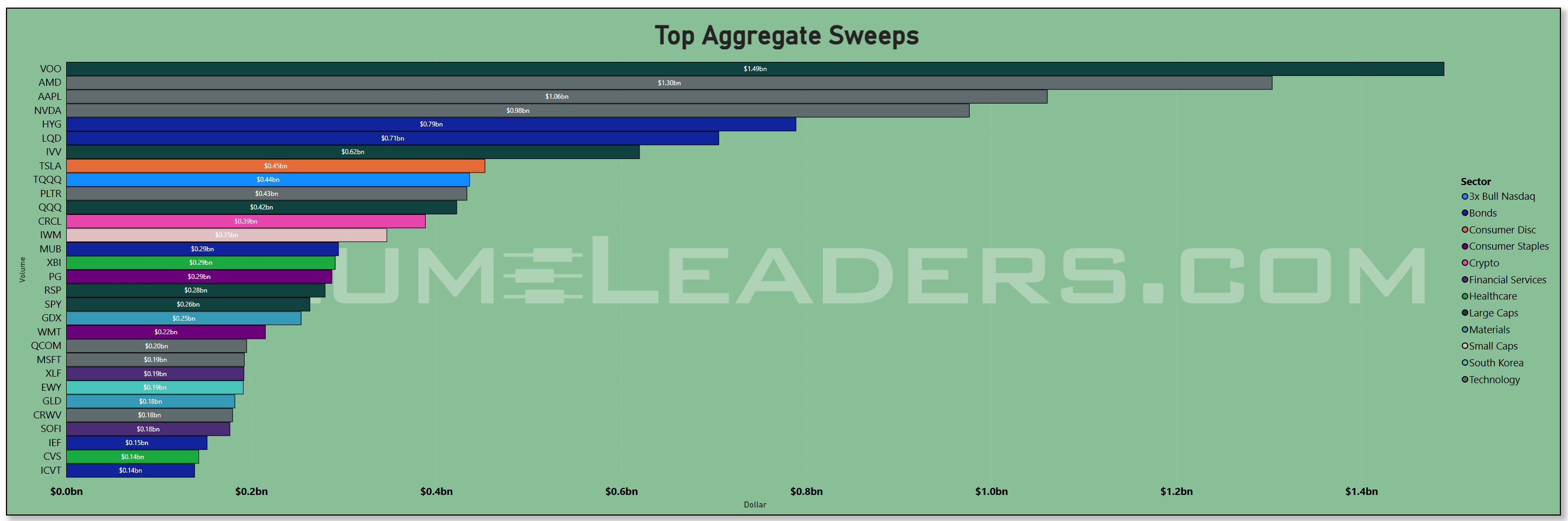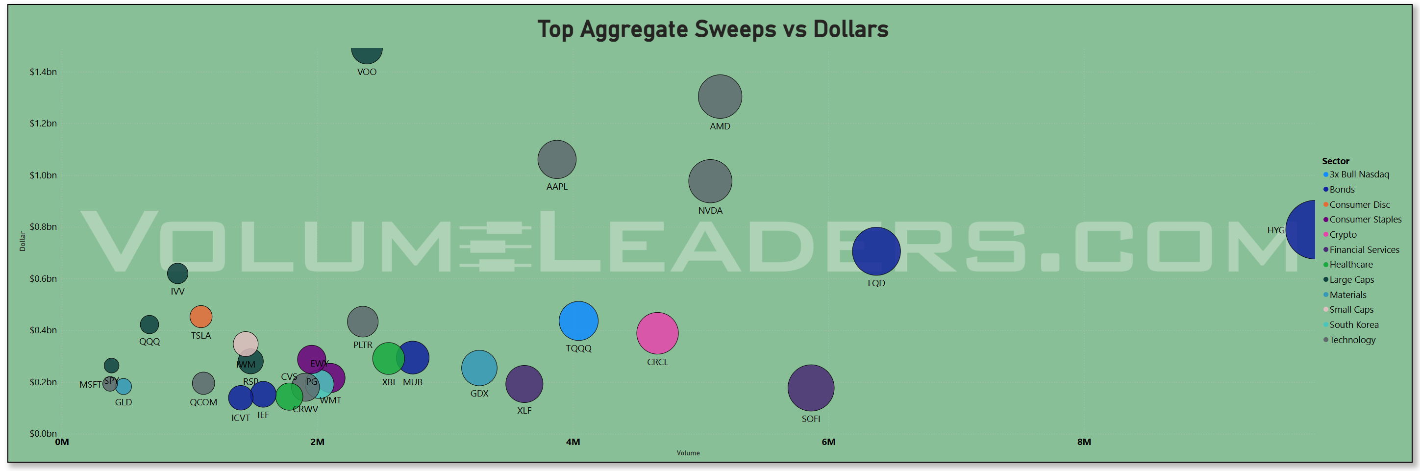 Sweeps tell you where the fast money is leaning, and the pattern there is more tactical than thematic. The largest sweep dollars cluster in VOO, AMD, AAPL, NVDA, HYG, LQD, IVV, TSLA, and TQQQ. That is an interesting barbell: on one side, levered beta (TQQQ), broad S&P exposure (VOO, IVV), and high-beta tech (AMD, NVDA, AAPL, TSLA); on the other, investment-grade and high-yield credit (LQD, HYG).