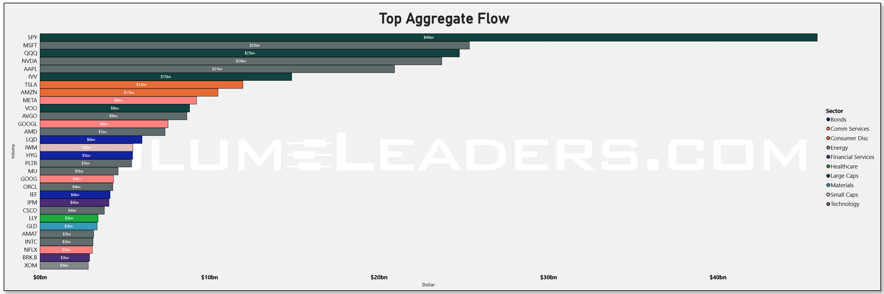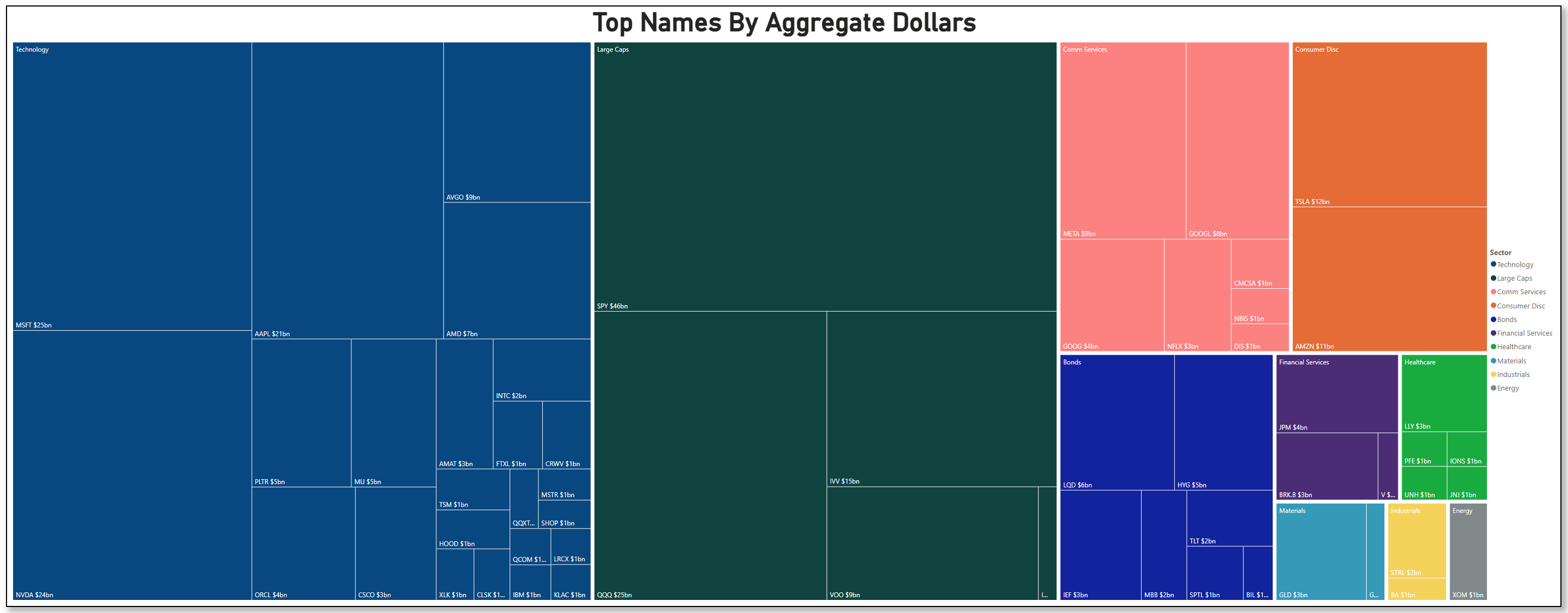 Drilling into names, the treemap and aggregate dollar bars confirm that broad beta and mega-cap tech remain the center of gravity. SPY alone traded about $46B in institutional dollars, dwarfing any single stock. QQQ and IVV added roughly $25B and $15B, respectively, and VOO another ~$9B, underscoring that passive exposure is still the preferred vehicle when allocators want equity risk. Within Technology, Microsoft (MSFT) led with about $25B in flow, followed closely by Nvidia (NVDA) around $24B and Apple (AAPL) near $21B. High-quality “infrastructure” names like Broadcom (AVGO) at ~$9B and Advanced Micro Devices (AMD) at ~$7B round out the spine.