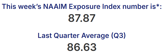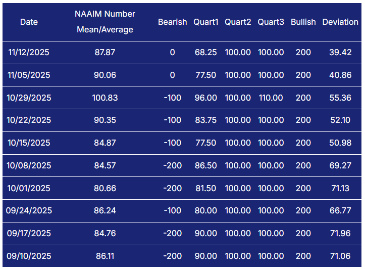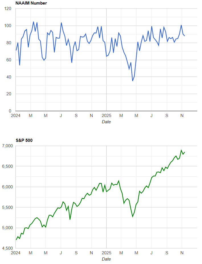 Against that emotional backdrop of the Bull-Bear-Spread%, the NAAIM Exposure Index shows active managers still running hot: the latest mean exposure is 87.87% after 90.06% last week and 100.83% on October 29. That sequence says professional money has trimmed a little, but is still mostly fully invested, leaving only modest dry powder and some vulnerability if selling accelerates. A slide in NAAIM down into the 50s without major index damage would suggest proactive risk management and create room for a more sustainable next leg higher; a push back above the mid-90s would instead mark renewed FOMO and a more fragile tape.