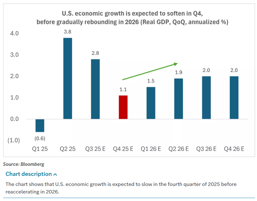 None of this erases the near-term hit to growth. The Congressional Budget Office estimates that the six-week closure will reduce real GDP growth in the current quarter by 1.5 percentage points. Prior to the shutdown, Bloomberg estimated that the U.S. economy was on pace to grow around 2.5% to 3.0% in the fourth quarter of 2025. The CBO’s estimate implies that growth will likely land closer to the 1.0% to 1.5% range. The CBO does, however, expect more than half of the lost activity to be recovered early next year as programs resume and workers receive back pay.
