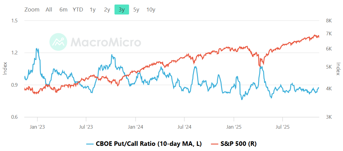 The CBOE total put/call ratio, shown as a 10-day moving average, is hovering around its mid-range near 0.9. Over the past three years, spikes toward roughly 1.2 have lined up with genuine stress events and tradable lows, while dips down near 0.7 have usually marked complacent, late-stage rallies. The current level sits between those extremes, signaling neither panic hedging nor aggressive call-chasing. For risk-taking behavior this week that means the options market is cautious but not seized up; investors are buying some protection, yet there is still a meaningful appetite for upside exposure. If the moving average were to grind up through 1.0 while prices hold, that would indicate growing fear and improve the odds that any downside break is relatively shallow and followed by a sharp bounce. Conversely, a slide back under about 0.8 without a reset in prices would tell you traders are getting comfortable again and any subsequent shock could cut deeper.