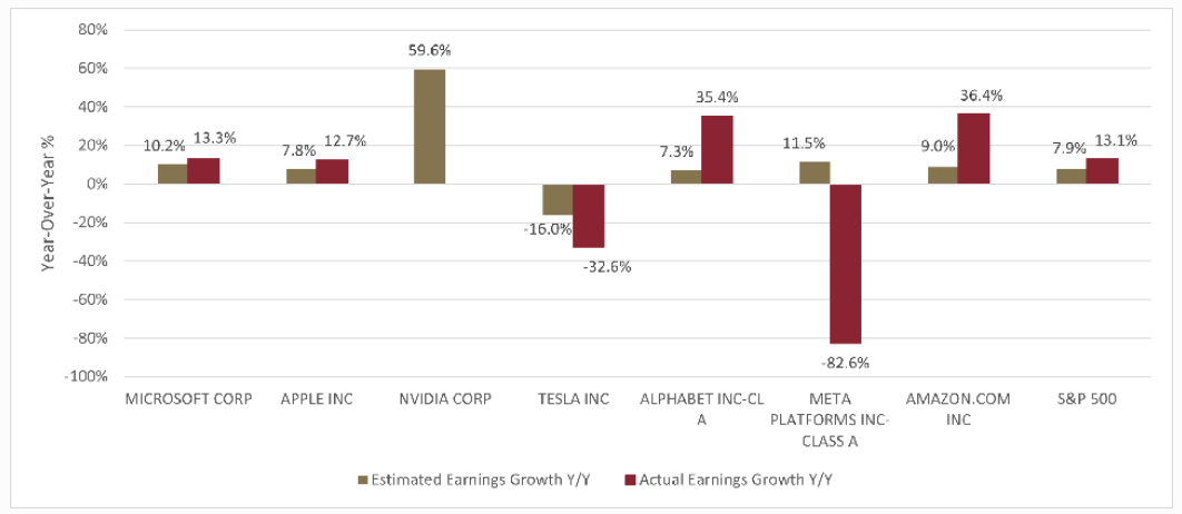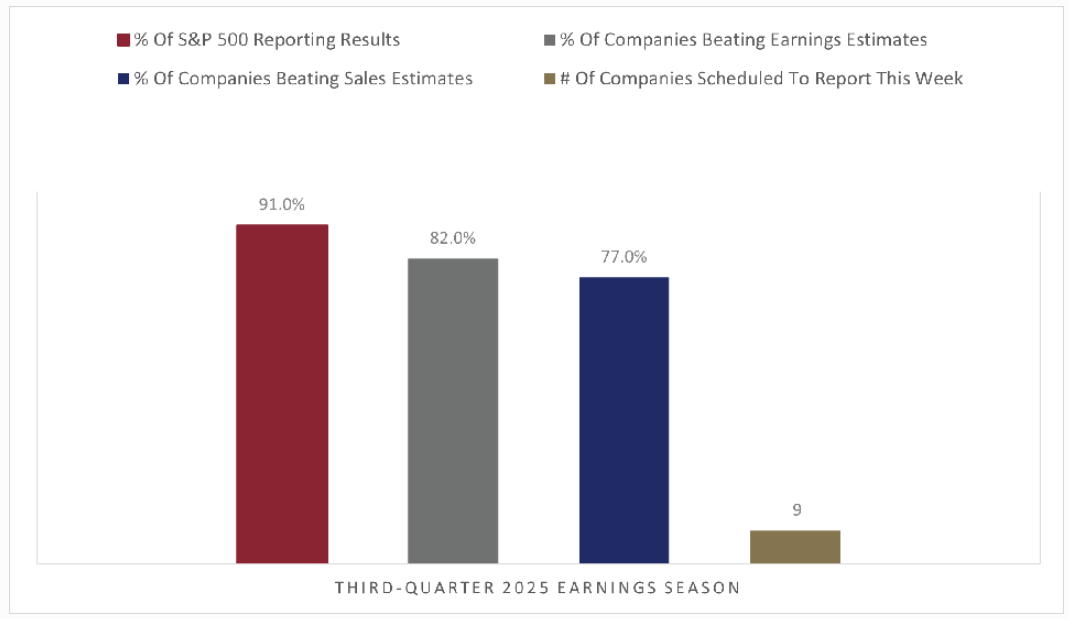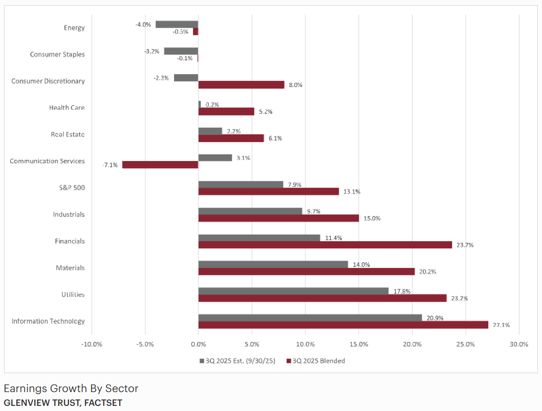 Despite all the macro noise, corporate fundamentals look stronger than the headlines might suggest. Q3 earnings season is nearly complete, and 82% of S&P 500 companies have beaten estimates, on pace for the best beat rate since 2021 according to Bloomberg Intelligence. Aggregate Q3 earnings are up 14.6% year over year, more than double the 7.2% growth that had been expected at the start of the quarter.