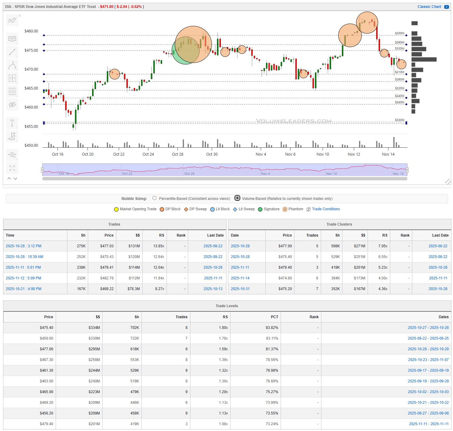 DIA is the most distributive of the four. The large orange circles near $475–$480 show repeated heavy selling, including significant prints in the $470s with eight-figure share sizes and $$ in the $120M–$170M zone. Clusters around $475 carry RS scores above 7X, evidence of sellers dominating that region during the recent balance. Support Levels below sit between $462 and $468 with notional in the $200M–$350M range, but they are not as imposing as SPY’s or QQQ’s shelves. A bullish rotation requires DIA to reclaim $470 with conviction; failure to do so invites further grinding lower toward $463 and potentially $460. For disciplined traders, invalidation becomes simple: strength above $470 is constructive, weakness below $463 keeps the bias pointed down.