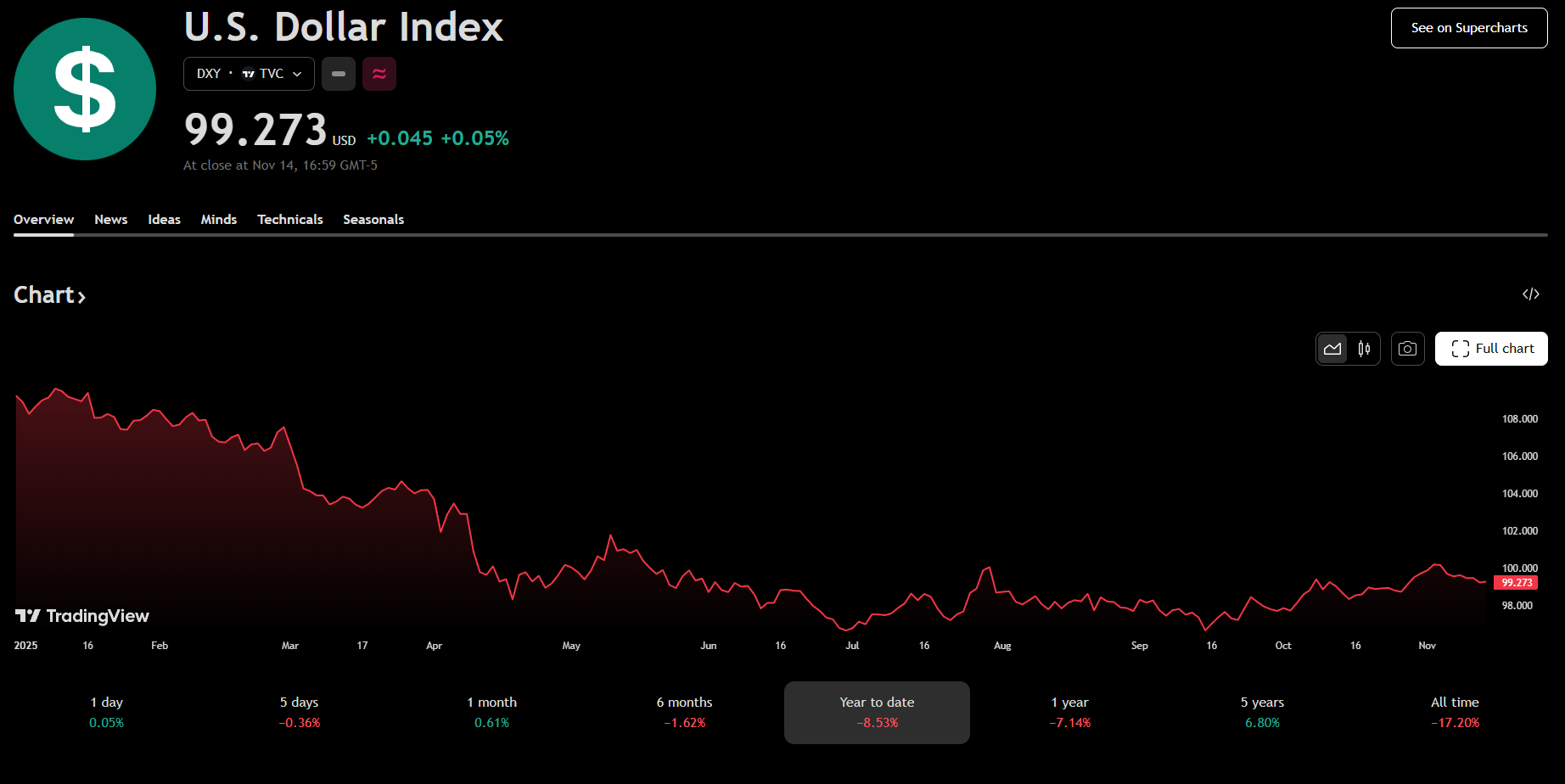 The internal divide at the Fed was highlighted by a widely read article from Wall Street Journal reporter Nick Timiraos, which discussed the idea of pairing a December cut with guidance that sets a higher bar for further reductions. Markets have taken the signal. Depending on the data source and day of the week, the implied probability of a December cut is now somewhere in the 43%–54% range, down sharply from readings near 95% a month ago and from 70% or more just a week earlier. One snapshot puts the probability of a rate cut following the December meeting at around 46%, another at 43%, and another at roughly 51%. The underlying message is clear: the market no longer assumes a December cut is a foregone conclusion.