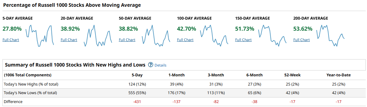 The Russell 1000 is where you see the real damage. Only 27.80% of constituents are above their 5-day average, and 38.92% above the 20-day. The 50-day cohort is stuck at 38.82% and the 100-day at 42.70%. As with the other indices, breadth only flips positive at the longer horizons, with 51.73% above the 150-day and 53.62% above the 200-day. New highs and lows are ugly: in the last 5 days, 124 stocks (12%) have printed new highs while 555 (55%) have hit new lows, for a crushing net of -431. The 1-month difference is -137, the 3-month is -82, and the 6-month still sits at -38. Even the 52-week and year-to-date columns are negative at -17. This is the broad market telling you that under the hood, the average stock has been under steady pressure for some time.