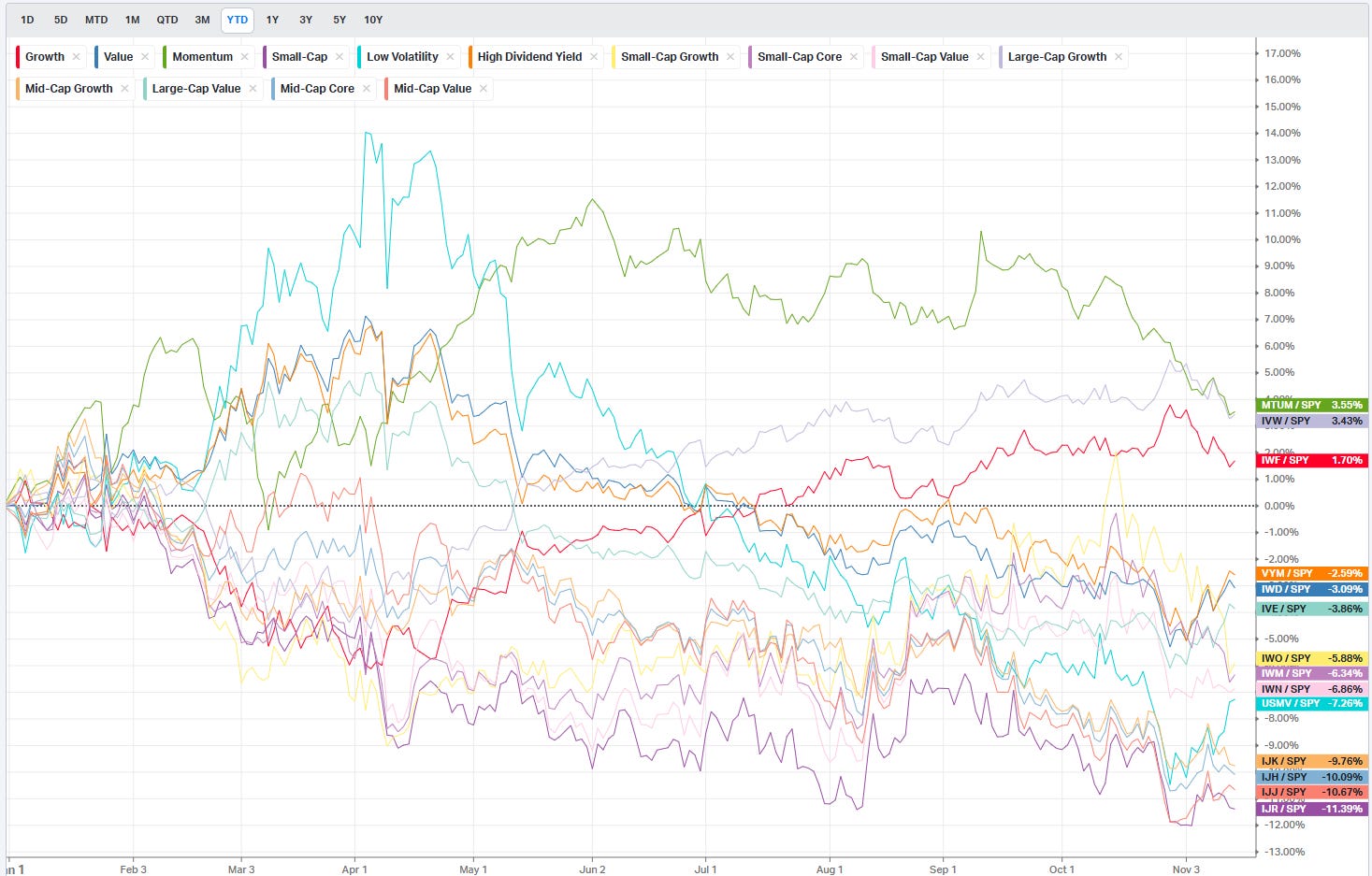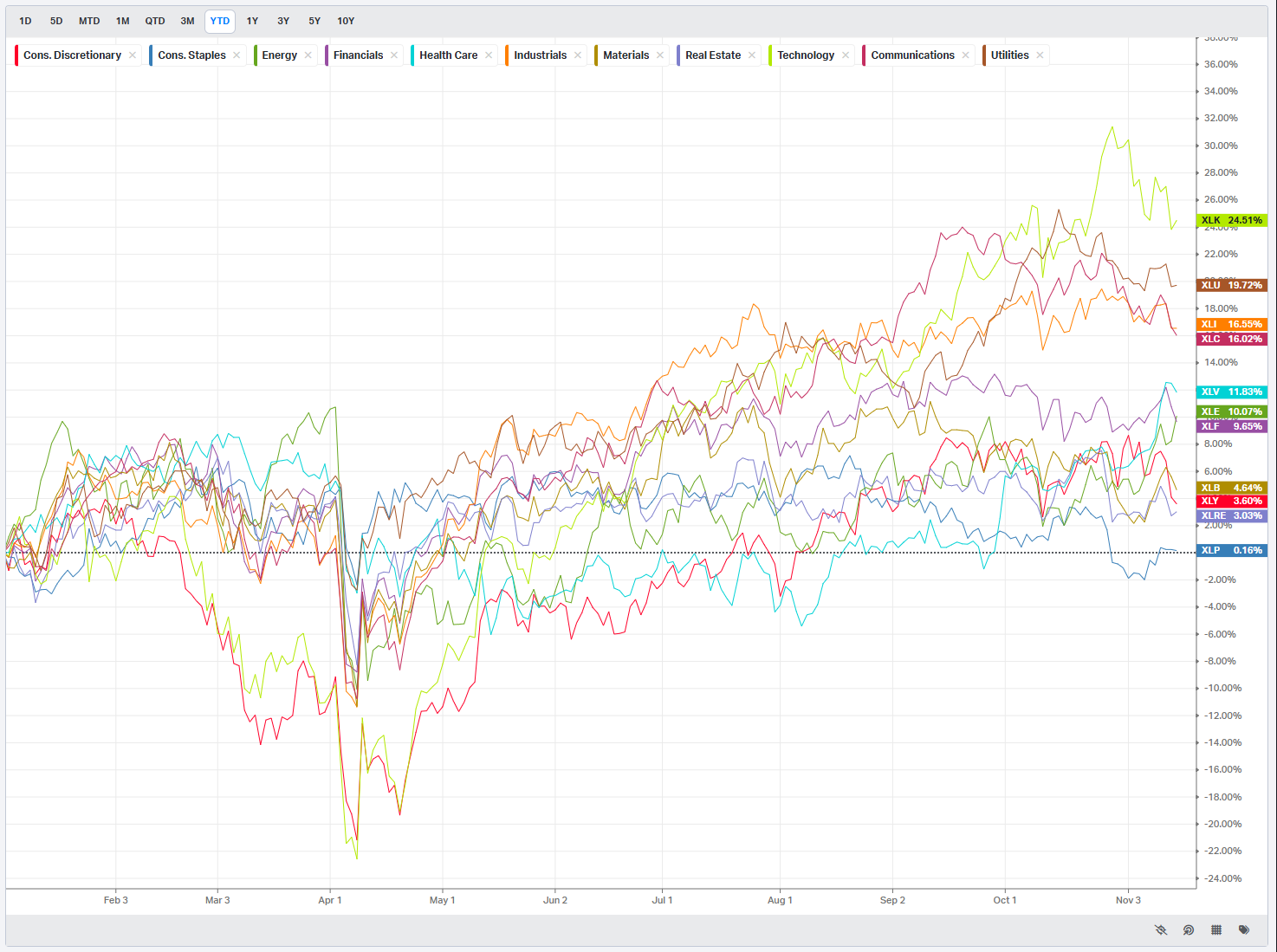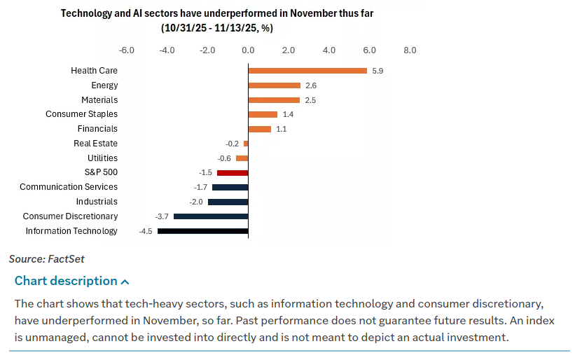Yet those results have not prevented a marked rotation in equity leadership. After a nearly 55% rally in the Nasdaq since the April 8 lows, technology and AI-related names have been under pressure. Elevated expectations, extended valuations, and rising concerns about the path of rates have all contributed. In November to date, technology has underperformed, while sectors such as health care, energy, and materials have outperformed.
