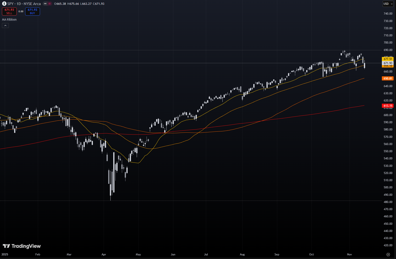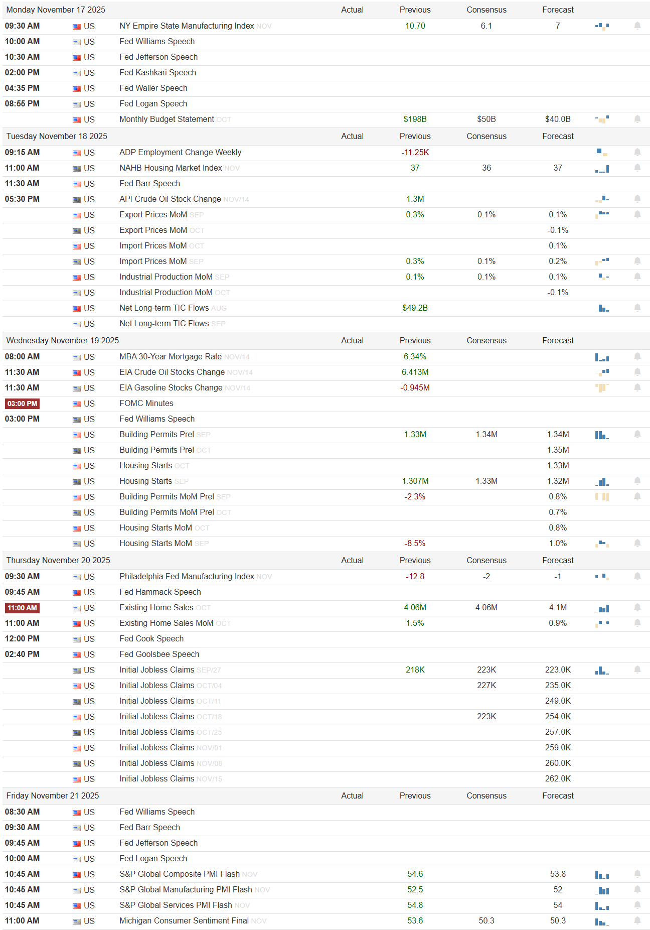 That rotation accelerated midweek. On Wednesday evening, the U.S. government shutdown officially came to an end when President Trump signed a spending bill that funds the government through January 30. Ironically, that headline marked the high for equities for the week. On Thursday, stocks traded sharply lower despite the resolution in Washington, and questions shifted from whether the shutdown would end to how long it will take for conditions to normalize. By Thursday’s close, major indexes were down more than 1.5%, with technology and high-momentum stocks bearing the brunt of the damage. Friday morning began with another wave of selling, S&P futures down more than 1%, and crypto breaking to fresh lows before dip buyers stepped in once again.