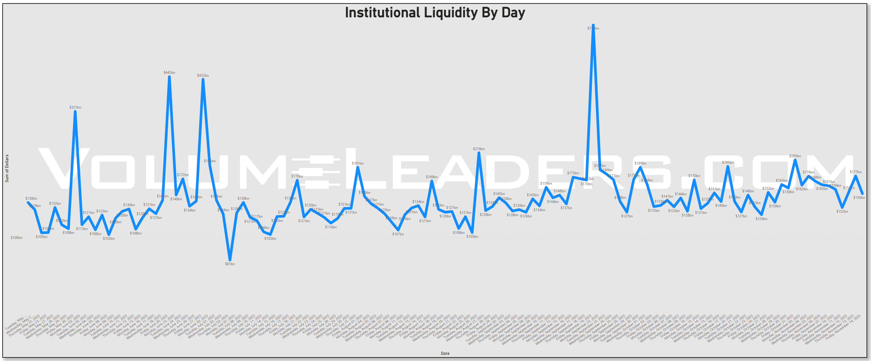 Institutional liquidity stayed robust but no longer manic this week. The multi-month series still shows the monster spikes from earlier in the quarter that coincided with index rebalances and major expiry dates, but the latest stretch has settled into a more sustainable $130B–$180B per day band. That shift matters: we are not in a vacuum of participation, but the tape has transitioned from forced flow to deliberate allocation. The result is a market that still has plenty of depth, yet is far more sensitive to where the marginal dollar chooses to hide.