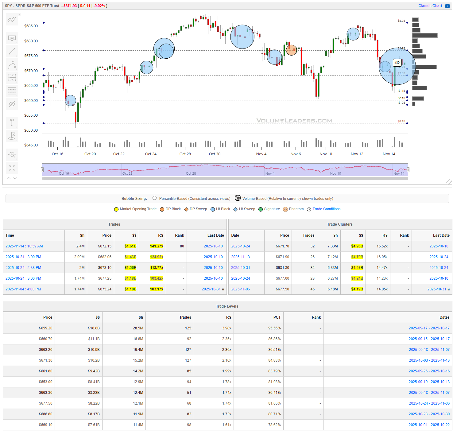 SPY carried the cleanest structure of the four. The cascade lower accelerated into a cluster of heavy prints around the mid-$670s, including notable buys near $671–$672 with $$ values in the $14–$18B range and RS readings north of 140%. Those are meaningful trades, and the #80 tag on one of the clusters highlights that a historically large accumulation occurred just off the lows. Below that area, the Level table shows dense support between roughly $659 and $663, with notional stacks ranging from about $9B to $18B and PCT scores above 80% in several rows. This makes the $663–$671 band the primary line of scrimmage. Acceptance above the weekend lows followed by a push through the $671 shelf would signal buyers are absorbing the liquidation and preparing to rotate back toward the $680–$683 region where prior heavy clusters sit. A failure back through $663 instead reopens the lower shelves toward the high $650s, where only lighter Levels remain and liquidity thins out. For a tactical trader, the cleanest structure favors waiting for either acceptance above $671 for a momentum continuation, or a spike-down rejection below $663 for a fade back into the range. Anything in between is churn.