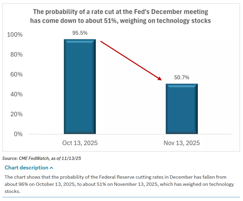 At the same time, these companies are transitioning from asset-light models to more asset-heavy ones. Investment in data centers and AI infrastructure could reach upwards of 500 billion dollars next year. That level of spending may compress margins and free cash flow in the near term, even if it enables future growth. The shift is occurring just as markets reassess the likelihood of near-term rate cuts, with December cut probabilities sliding from around 96% on October 13, 2025 to about 51% on November 13, 2025. Higher funding costs, more leverage, and heavier balance sheets represent a different environment from the one that powered the last several years of tech outperformance.