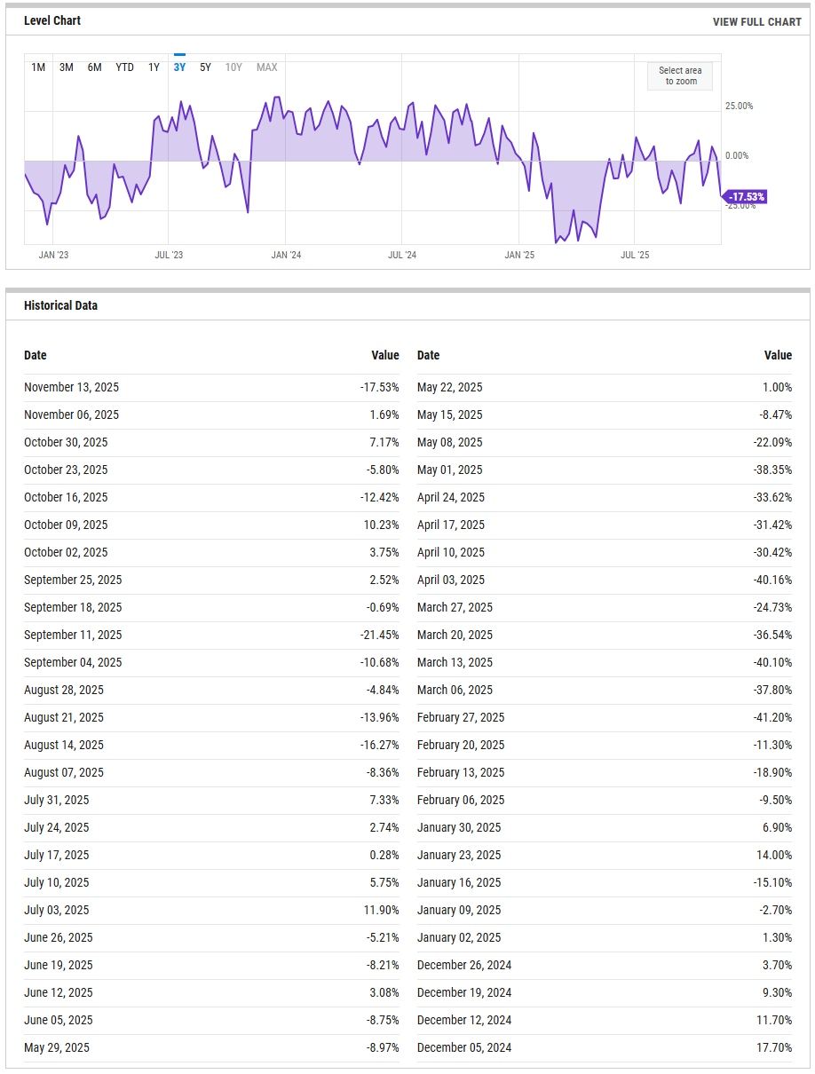 The AAII bull minus bear spread has flipped hard to the pessimistic side. The latest reading for November 13 is -17.53%, down from +1.69% last week and +7.17% the week before. In other words, we have moved from mild optimism to a clear net-bearish stance in just two weeks. The current level is not quite as washed out as the -21.45% seen on September 11, but it is back in the zone where past selloffs have started to exhaust. Historically, readings below 0 tend to support better forward returns as pessimism rises, while anything beyond roughly +20 signals a crowded bullish camp. If the spread were to push through -20 again without price stabilizing, it would argue there is still more forced de-risking to come; a snap back above 0 would be an early tell that dip-buyers are finally overpowering the bears.