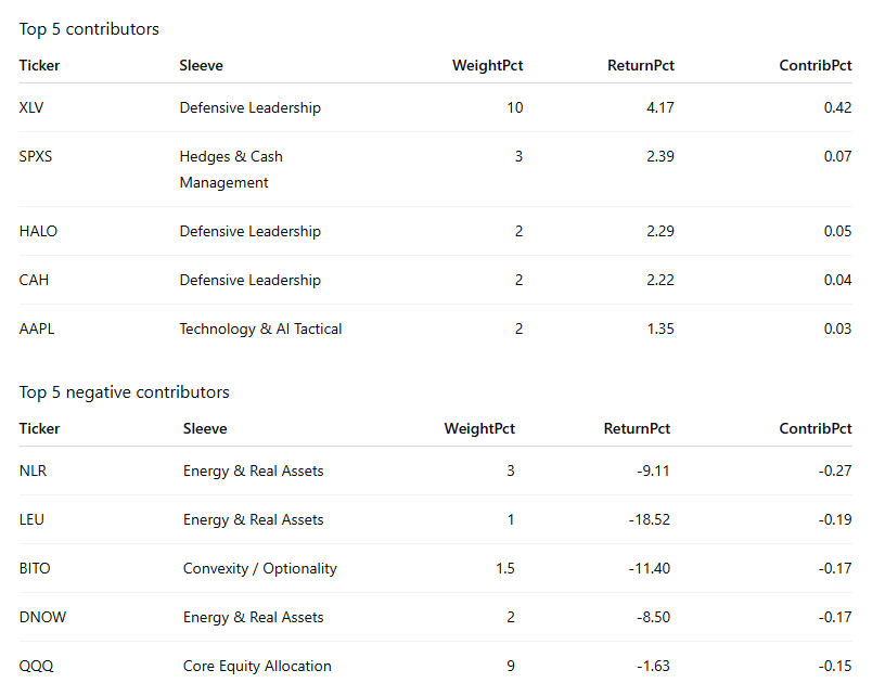 Net-net, the structure largely behaved as designed: health care, hedges, and metals helped; broad indices and quality tech were small headwinds; and the real hit came from concentrated commodity and crypto risk. The takeaway for next week is not that the framework is broken, but that sizing in the highest-volatility sleeves needs to be respected when those tapes turn.