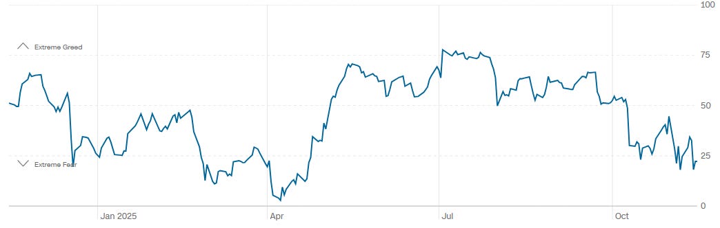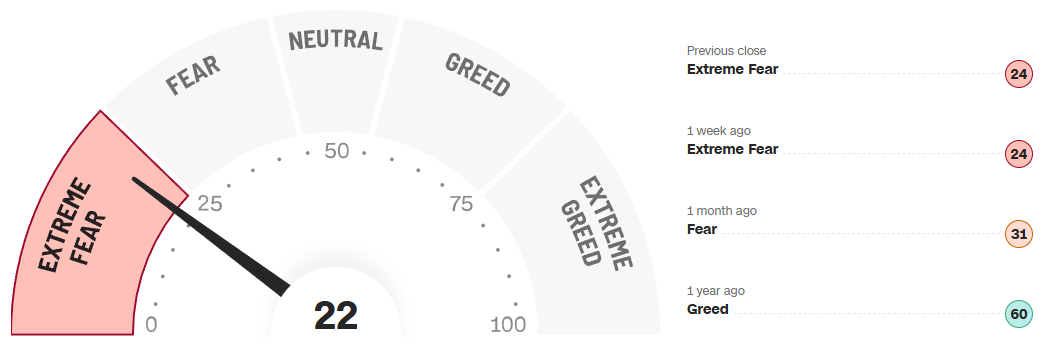 The CNN Fear & Greed composite sits at 22, firmly in the Extreme Fear band. That is a notch below the previous close and last week’s reading of 24, and down from 31 a month ago, when conditions were merely labeled Fear. One year ago the gauge stood at 60, in outright Greed, underscoring how far sentiment has swung from euphoria to caution over the past twelve months. The one-year path shows a full cycle: fear in the spring, a surge to extreme greed above 75 in June and July, and then a steady stair-step lower into today’s low-20s. This kind of persistent fear regime often coincides with choppy tape and reluctant buying, but it also tends to lay the groundwork for better forward returns once selling pressure exhausts. A decisive break below 20 would mark true capitulation and usually offers a better entry window for medium-term buyers; a rebound back toward the 50 zone would signal that the market has digested the scare and is transitioning toward a more neutral, trend-friendly environment.