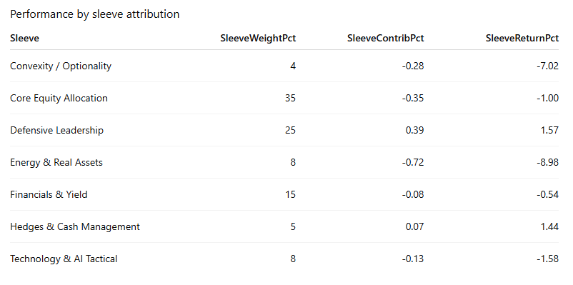 Financials & Yield were a minor drag, down about -0.5% at the sleeve level and -0.08% on contribution. VCLT and XLF both slipped just under -1%, each costing about -0.04%, while BOKF edged lower and JEPI and JPST were essentially unchanged. As intended, this sleeve behaved like ballast rather than a driver in either direction.