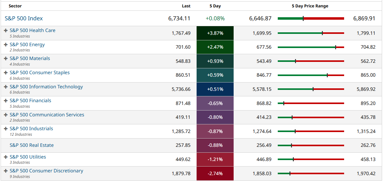 Health care has led the pack for two consecutive weeks. The sector gained 4% this week, narrowing a year-to-date performance gap that had been stubbornly wide. Biotech remained strong, helped by another major M&A transaction as Merck (MRK) agreed to buy CDTX (CDTX) for roughly 9 billion dollars. Large-cap pharma and medical equipment stocks traded higher, while managed care and hospital names lagged because ACA subsidies were not directly addressed in the shutdown legislation. Energy and materials stocks also moved higher despite a volatile commodities backdrop.