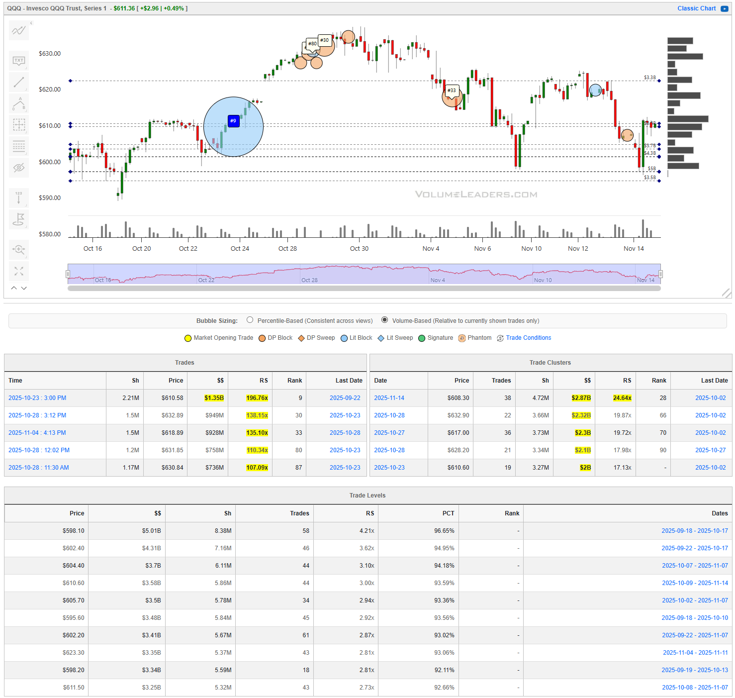QQQ offers a similar but slightly stronger response dynamic. The standout trade is the 2.21M-share buy around $610.58 with roughly $1.36B in notional and a 196% RS, one of the largest relative prints in the visible dataset. That tells you that real money stepped in aggressively at first touch of the low $610s. The Level grid confirms why: the shelves at $598–$611 are packed with $1.8B–$5B in notional with PCT marks of 85–96%. Once QQQ reclaimed the $610–$615 region, buyers defended it several times. On the upside, clusters around $628–$632 show $$ tallies in the $2.8B–$3.2B range with RS readings around 20X, making that the first major resistance band. A bullish path requires acceptance above $620 and then a clean rotation into the $628–$632 block; if buyers stall below that, the tape remains corrective. A bearish break comes from losing $610 on strong volume, which would force a revisit of the deep support shelf toward the high $590s.