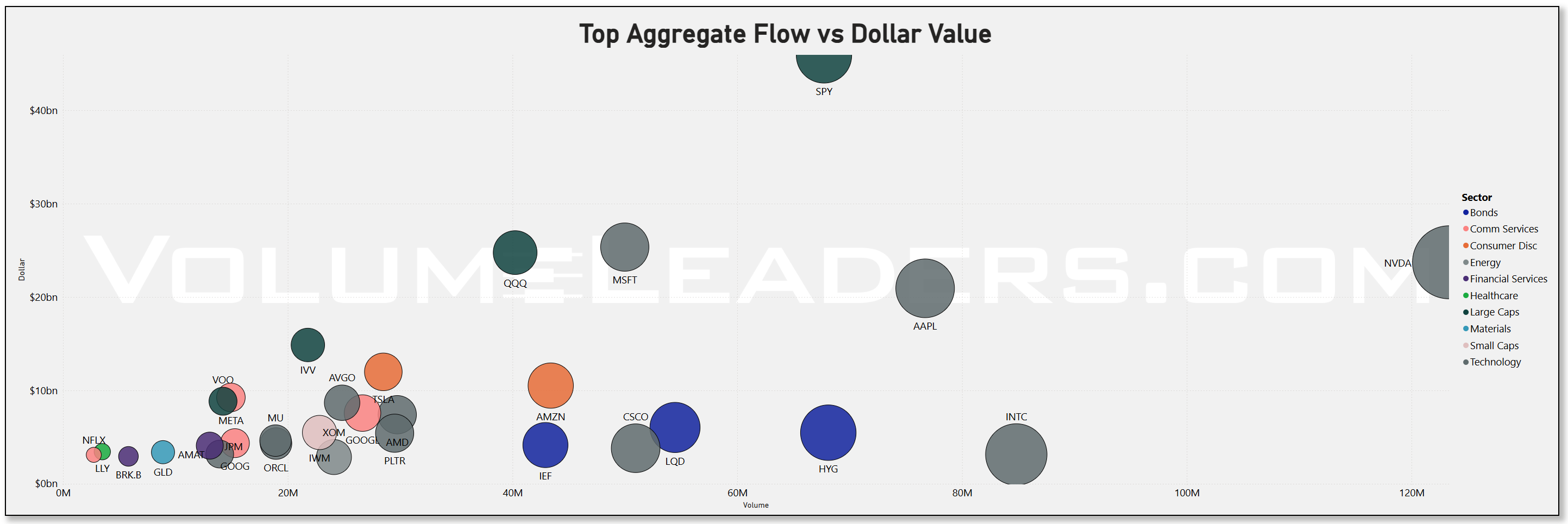 The scatter of volume versus dollars puts a finer point on that story. NVDA is out on the far right with very high share volume and north of $20B in notional turnover, but MSFT and AAPL are not far behind on the dollar axis despite somewhat lower prints. QQQ and SPY cluster at the high-dollar, high-volume pole, joined by IVV; that grouping is textbook “allocation” flow rather than a directional stampede. Credit sleeves like LQD and HYG also show up with multi-billion dollar footprints, reinforcing the idea that some investors are rotating toward carry and credit beta instead of abandoning risk altogether.