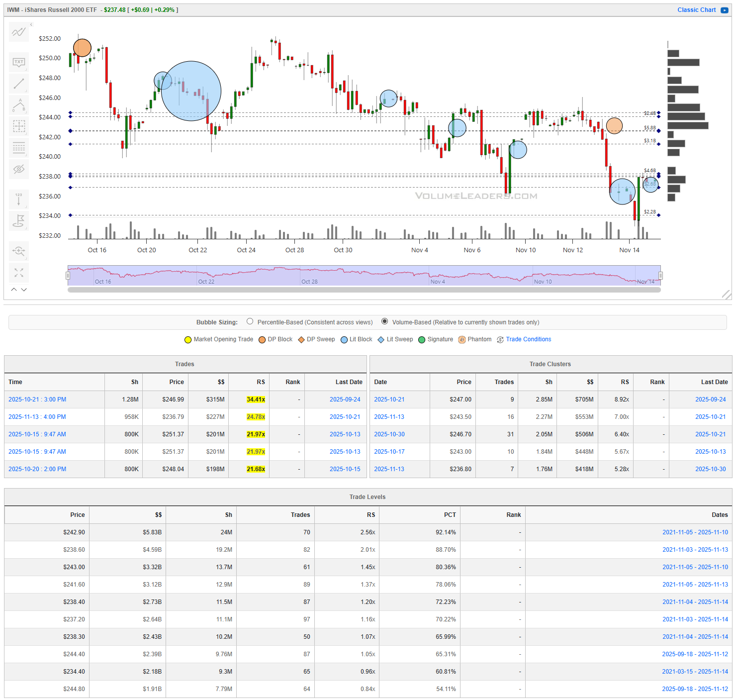 IWM had early signs of responsive buying, including prints in the $246–$249 zone with $200–$300M per block and RS readings in the 20X–34X range. But unlike SPY and QQQ, the follow-through was thin and each attempt to build a higher low met quick rejection. The most critical band is $236–$239, where clusters hold $418M–$705M with RS from about 5X to 9X. IWM’s close just above that region leaves it perched on a knife’s edge. A bullish case requires holding $236 and reclaiming the $243–$246 shelf where several large prints and Level concentrations reside. A loss of $236, especially with a swift pick-up in block selling, reopens air down to the low $230s where no strong Levels appear. Tactically, the asymmetry favors watching for a flush that instantly reverses, rather than preemptively buying support that has not proven itself.