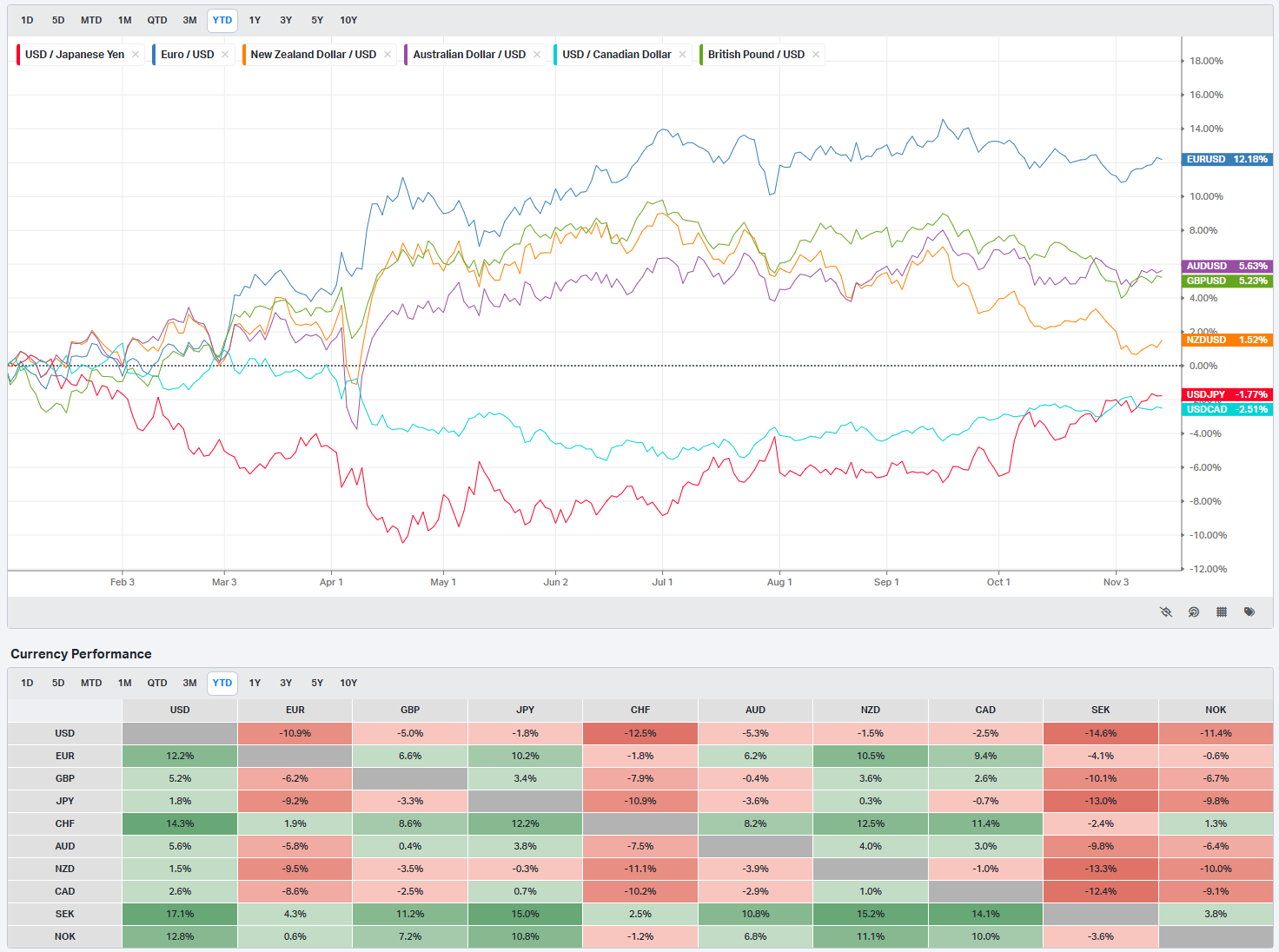 Municipal bonds outperformed Treasuries as issuance ramped up on Wednesday following the Veterans Day holiday and new deals were generally oversubscribed. High yield bonds advanced on idiosyncratic news and earnings before partially retracing gains as the macro tone weakened. In Europe, government bond yields pushed higher as well. The 10-year German bund yield climbed to a five-week high of 2.720% and finished on that level, while the 10-year UK gilt yield rose to a one-month high of 4.579% before closing at 4.574%, up 13.7 basis points. Eurozone Q3 GDP was revised up by 0.1 percentage point to 1.4% year over year. Swaps are discounting only a 3% chance of a 25 basis point rate cut by the ECB at its December 18 meeting.