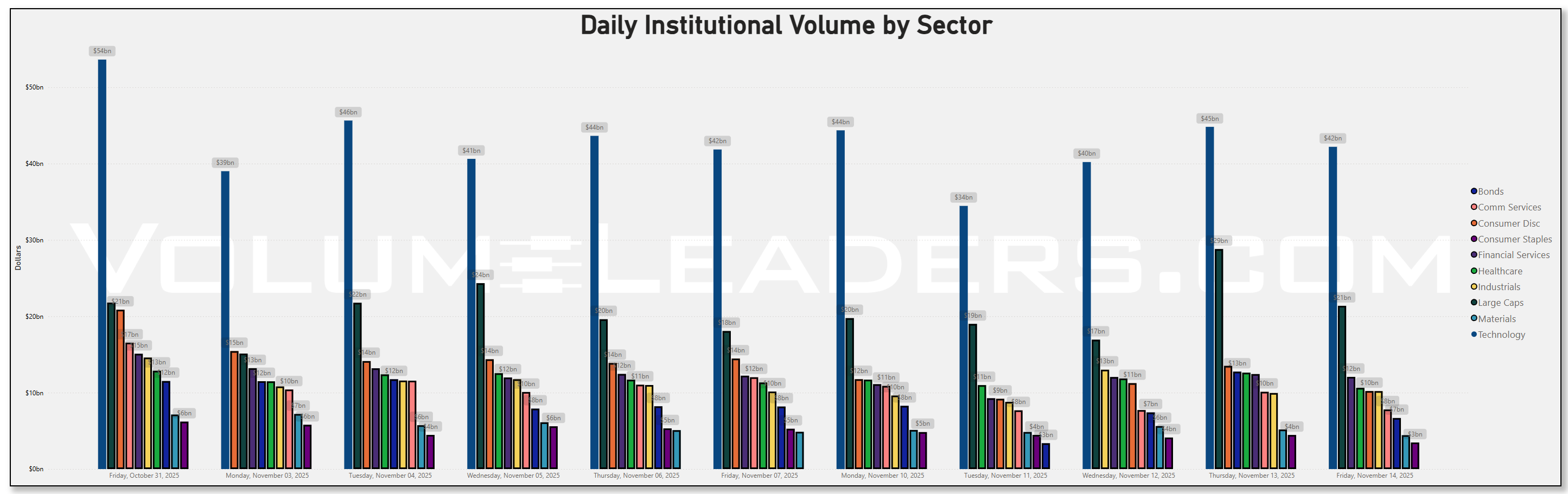 The sector dollar table makes that rotation very clear. Technology remains the single largest sponge for institutional capital, printing $44.3B on Monday and finishing the week with $42.2B on Friday, but that is notably below the $53.6B peak from October 31. Large Caps as a sleeve ran hard into Thursday, with notional volume jumping to $28.8B on November 13 versus $18.1B the prior Friday, before slipping back to $21.4B on Friday. Bonds also saw a surge that day, to $12.7B versus roughly $8.2B a week earlier, suggesting that the same macro tape—fading conviction in a December rate cut and growing unease around AI-heavy growth exposure—drove both de-risking and duration bids at once. Fed officials have spent the past week emphasizing a “high bar” for additional easing, and market-implied odds for a December cut have slid from near 95% in mid-October to roughly one-half in mid-November. That repricing showed up in the flows: Financial Services dollars were steady but not dominant, while defensives such as Healthcare and Utilities held their ground even as Technology dollars ebbed from their late-October extreme.