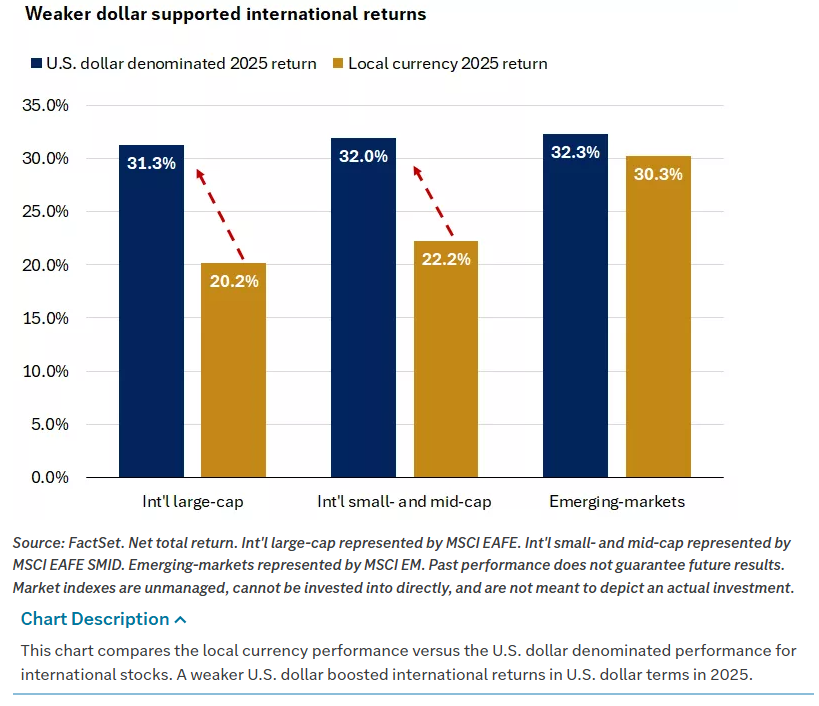 Third, international stocks outperformed U.S. equities by 13%, the largest margin since 2009. Fiscal stimulus in Germany, monetary easing by the European Central Bank, and surging corporate profit margins in Japan supported developed markets. A weaker U.S. dollar played a major role, declining more than 9% on the ICE U.S. Dollar Index, the steepest annual drop since 2017. Emerging market equities gained 32%, led by technology-heavy regions like China and Korea.