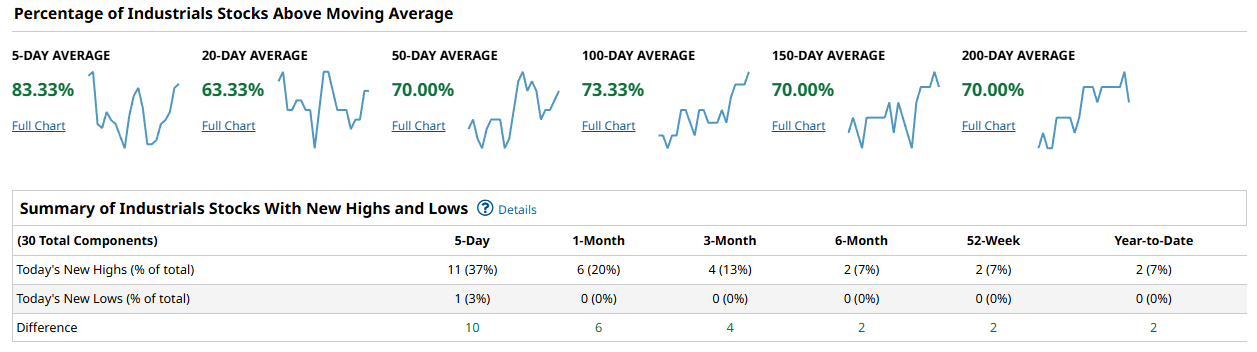 The Dow is the cleanest breadth picture of the four. You have 83.33% above the 5-day, 63.33% above the 20-day, and 70.00% above the 50-day, and it gets even better as you move out in time with 73.33% above the 100-day and 70.00% above both the 150-day and 200-day. That is what durable participation looks like: not just a short-term pop, but an intermediate trend that has a lot of names holding above rising reference levels. The new highs list confirms the tone: 11 new highs versus 1 new low over 5 days for +10, and there are no new lows at all across the 1-month, 3-month, 6-month, 52-week, or year-to-date windows shown. When Industrials breadth looks like this, it usually acts as ballast for the broader market because it signals cyclical appetite and fewer cracks in economically sensitive areas.