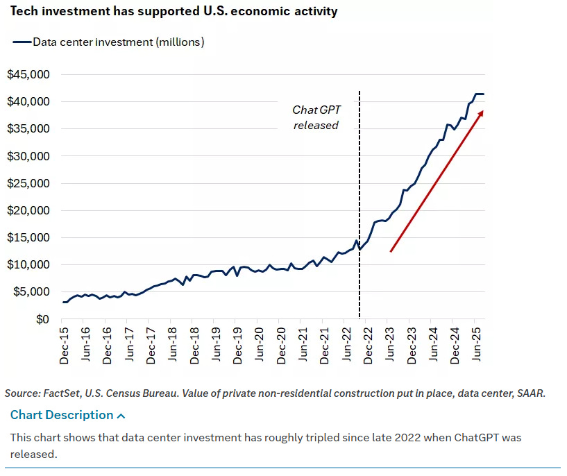 Data center investment has roughly tripled since the launch of ChatGPT in late 2022, and information processing equipment investment grew at an annualized rate of 8.4% in Q3, helping nonresidential investment average 6.5% quarterly growth through the first three quarters of the year.