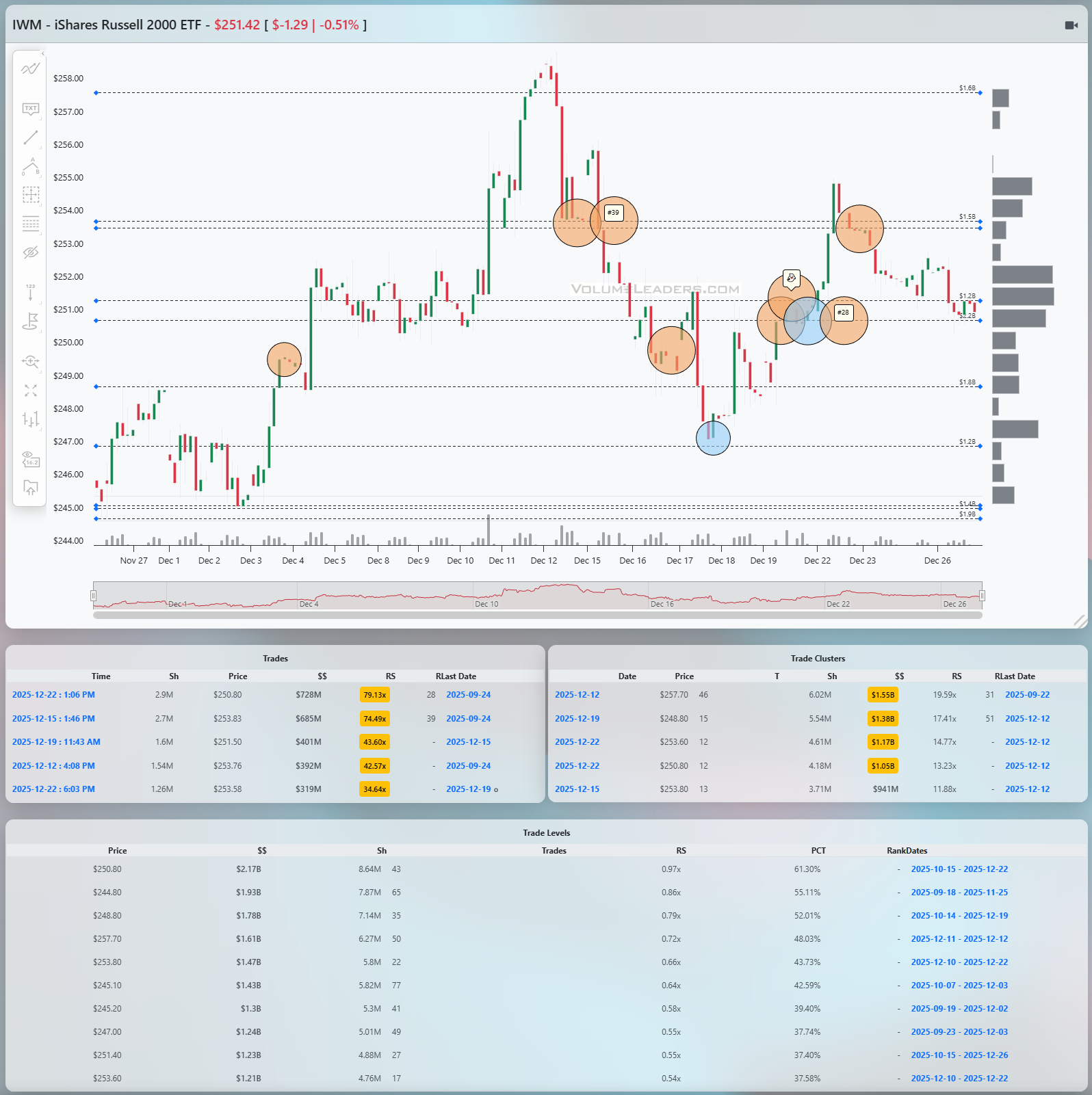IWM continues to be the most workmanlike of the group, and also the most honest. It rallied hard into mid-December, topping near the upper 250s, then unwound sharply into the high 240s. The low near 247 was met with a large print and immediate bounce, but unlike SPY and QQQ, the rebound here has been choppier. The Levels table shows the most significant notional concentrated between roughly 248 and 252, with RS readings that are solid but not extreme. That defines the current balance zone. Recent sessions saw attempts higher into the 253 to 254 area, marked by clustered selling, and price was pushed back toward the middle of the range. For IWM, the line of scrimmage is clear: 250 to 251. Acceptance above 253 would open a path back toward the highs, while failure below 248 would put the December lows back in play. Until one of those resolves, small caps are trading rotation, not impulse.