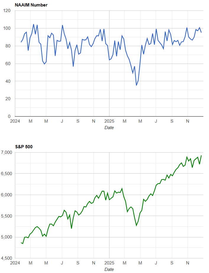NAAIM echoes that posture. The exposure index sits at 95.08 on 12/24/2025, down from 100.70 on 12/17, and in line with recent elevated readings like 97.13 (12/10) and 98.57 (12/03). Managers are largely in, which supports trend persistence when price is behaving, but it also reduces the amount of easy buying power left if the tape stumbles. A drop into the 50s without major price damage would be a constructive reset, while a push back toward the high 90s and 100s keeps the market vulnerable to any fast de-risking episode.